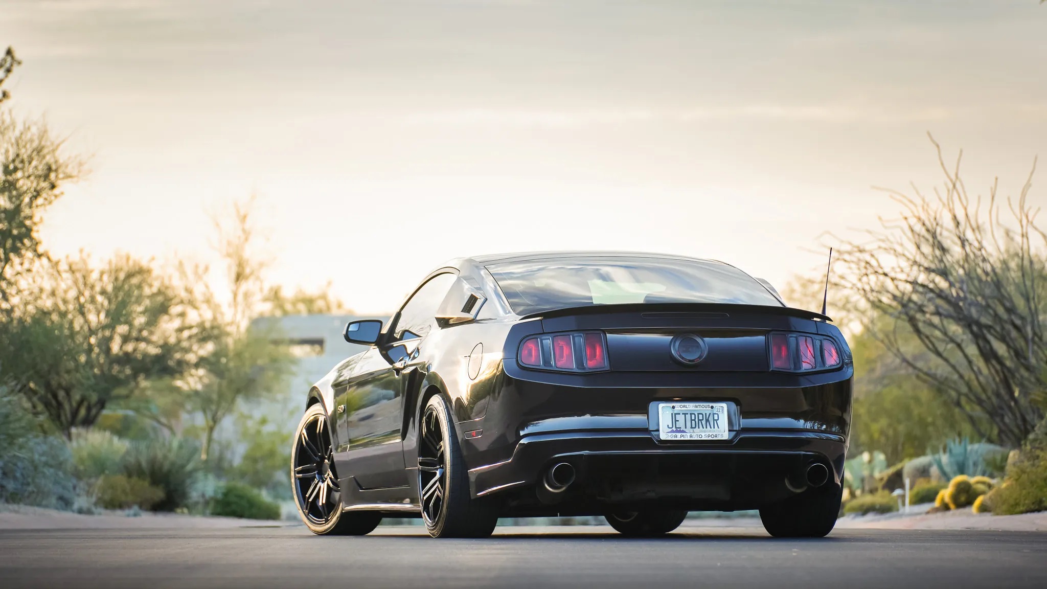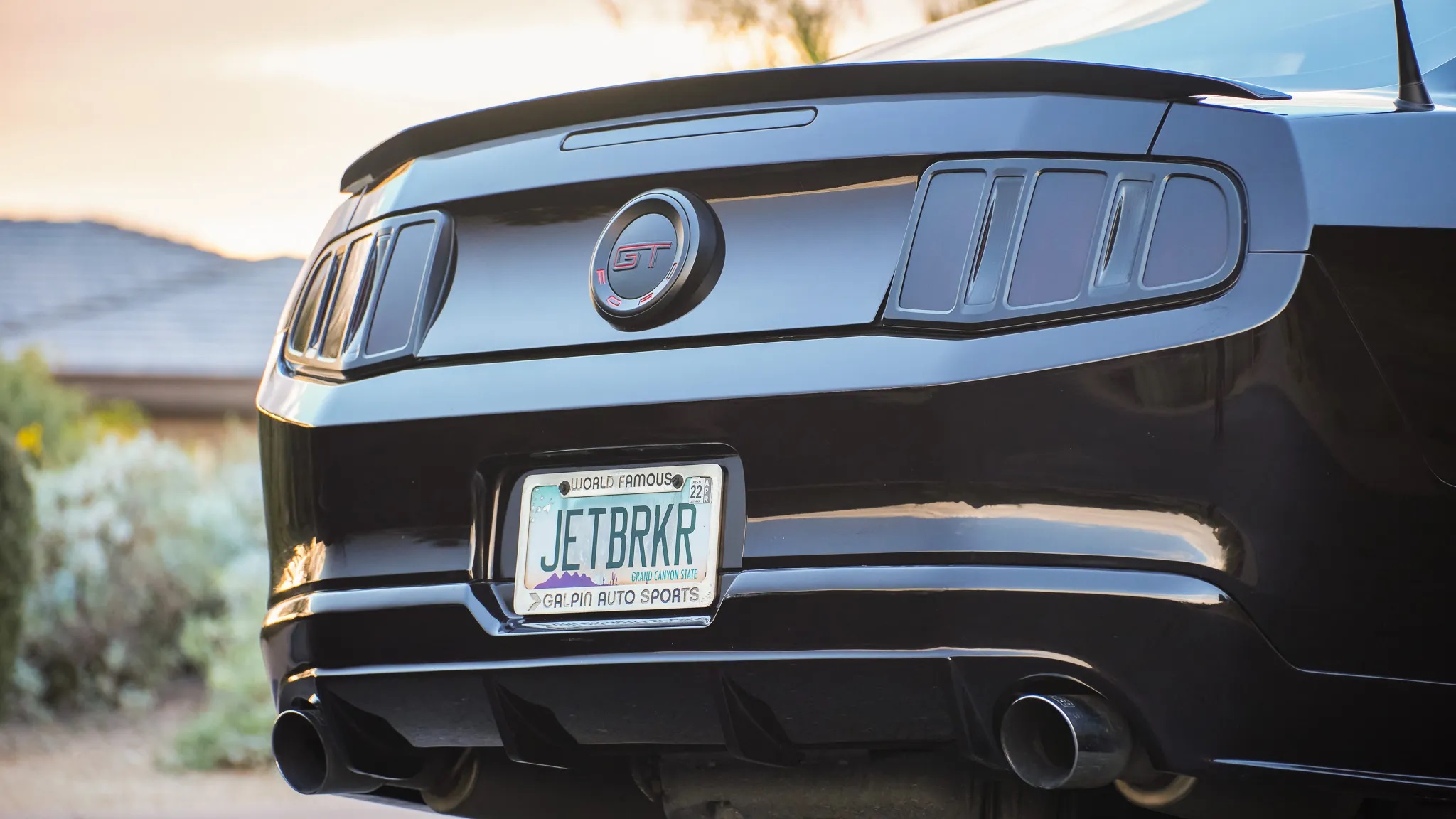 Additional features include an intercooler, a Boss 302 intake manifold, a Ford Racing camshaft, a Bama Performance ECU tune, a Bassani exhaust, a glass roof, an aftermarket body kit, Eibach lowering springs, Brembo front brakes, 20-inch wheels, a Hurst shifter, and a custom stereo system.