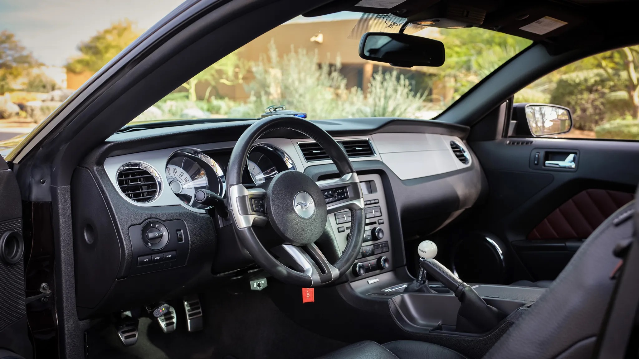 This 2012 Ford Mustang GT, modified by Galpin Auto Sports, features a Lava Red Metallic exterior with a two-tone black and burgundy leather interior. It is powered by a supercharged 5.0-liter Coyote V8 engine paired with a five-speed manual transmission.