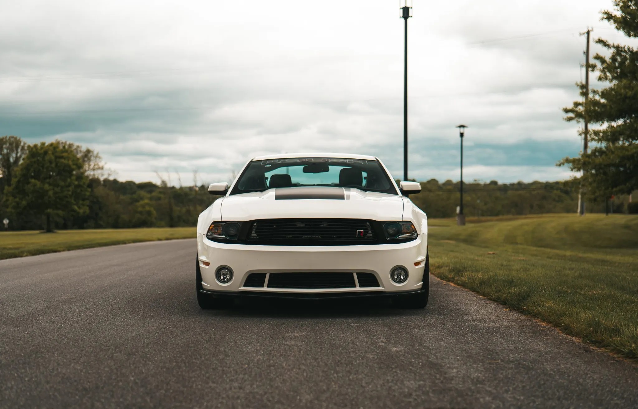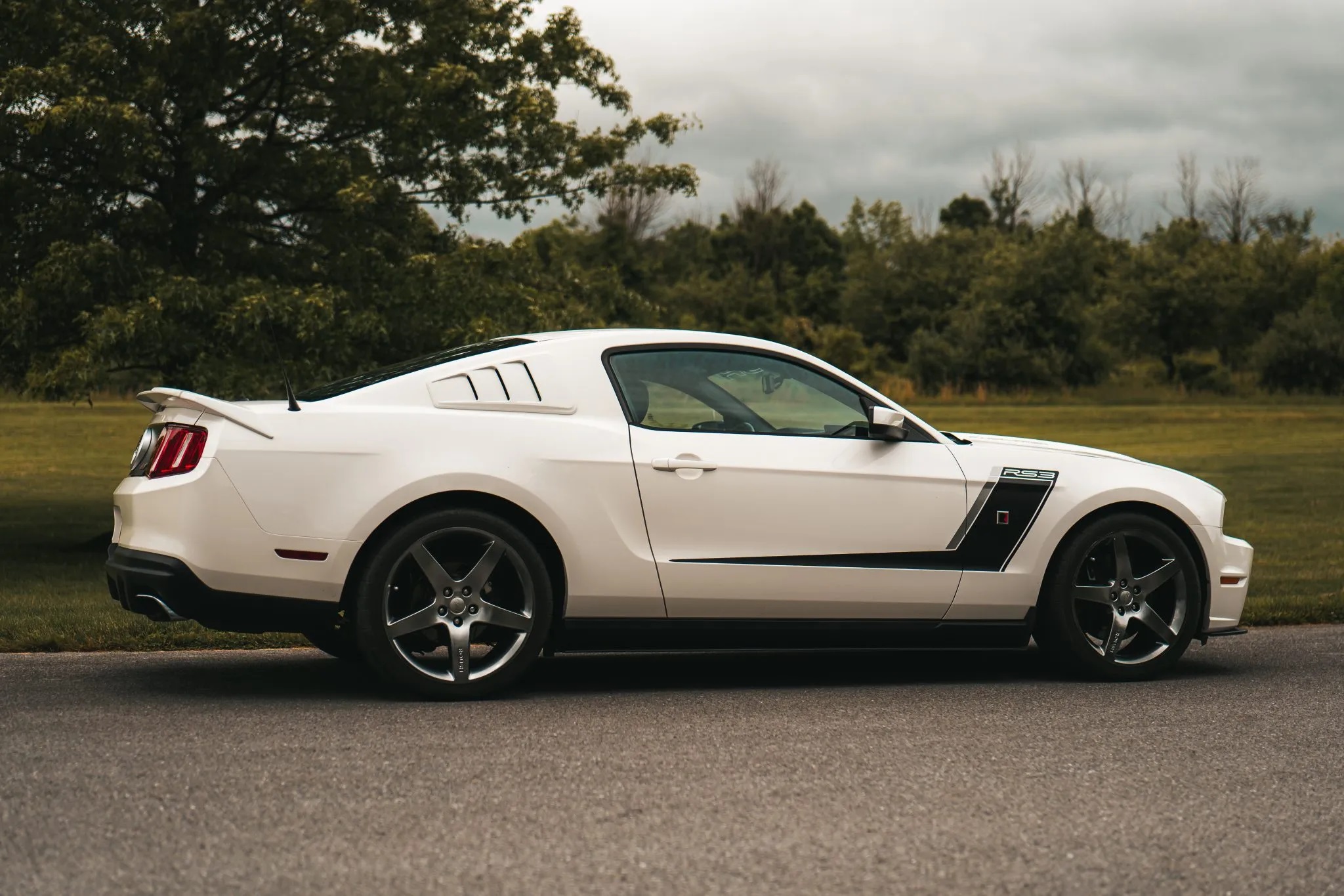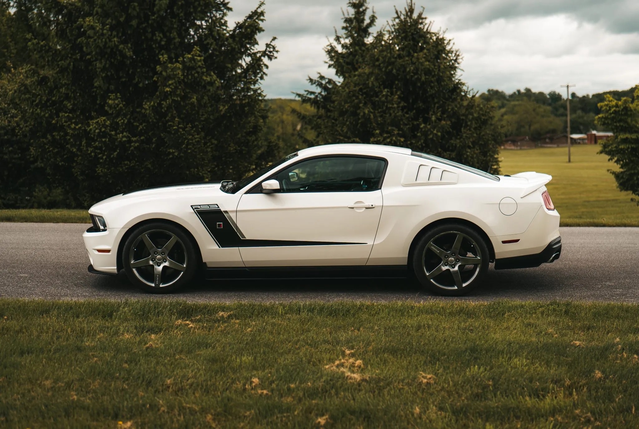This 2012 Ford Mustang coupe has been upgraded with the Roush Stage 3 package. It boasts a Performance White exterior over Charcoal Black leather upholstery. Key features include 20″ five-spoke forged wheels, HID headlights, fog lights, Roush-specific bodywork, a Roush suspension system, a performance brake kit, a rear spoiler, quarter window louvers, a CD stereo with a Shaker 500 audio system, air conditioning, and cruise control.