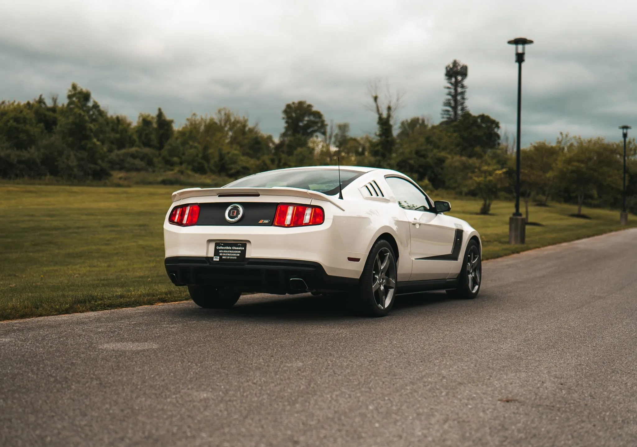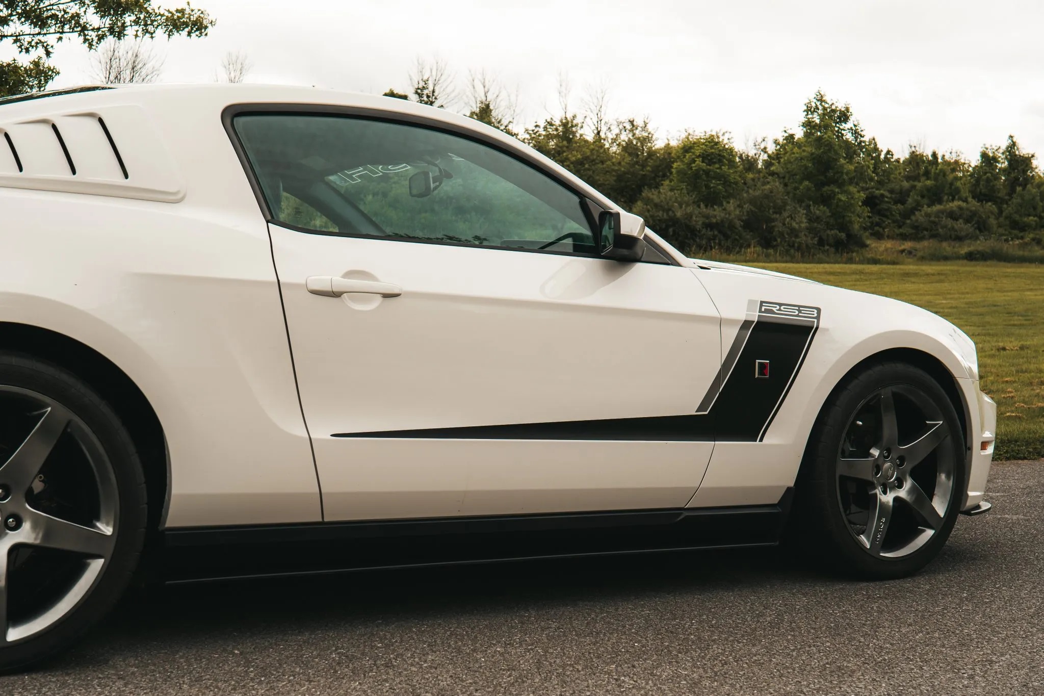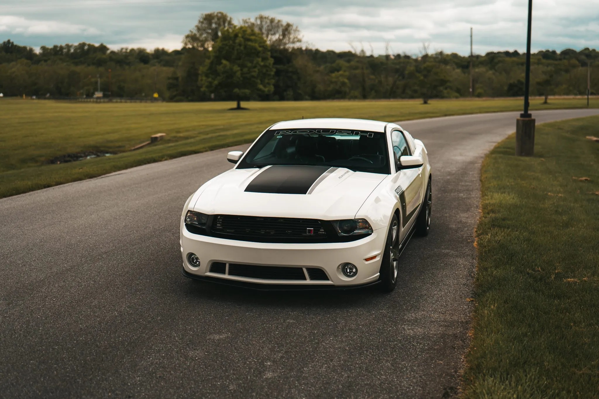 This 2012 Ford Mustang coupe has been upgraded with the Roush Stage 3 package. It boasts a Performance White exterior over Charcoal Black leather upholstery. Key features include 20″ five-spoke forged wheels, HID headlights, fog lights, Roush-specific bodywork, a Roush suspension system, a performance brake kit, a rear spoiler, quarter window louvers, a CD stereo with a Shaker 500 audio system, air conditioning, and cruise control.