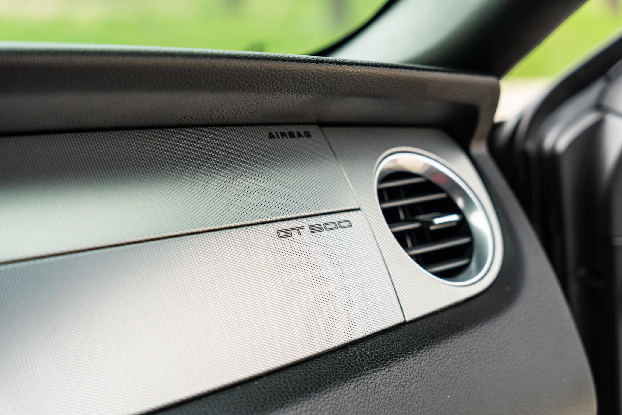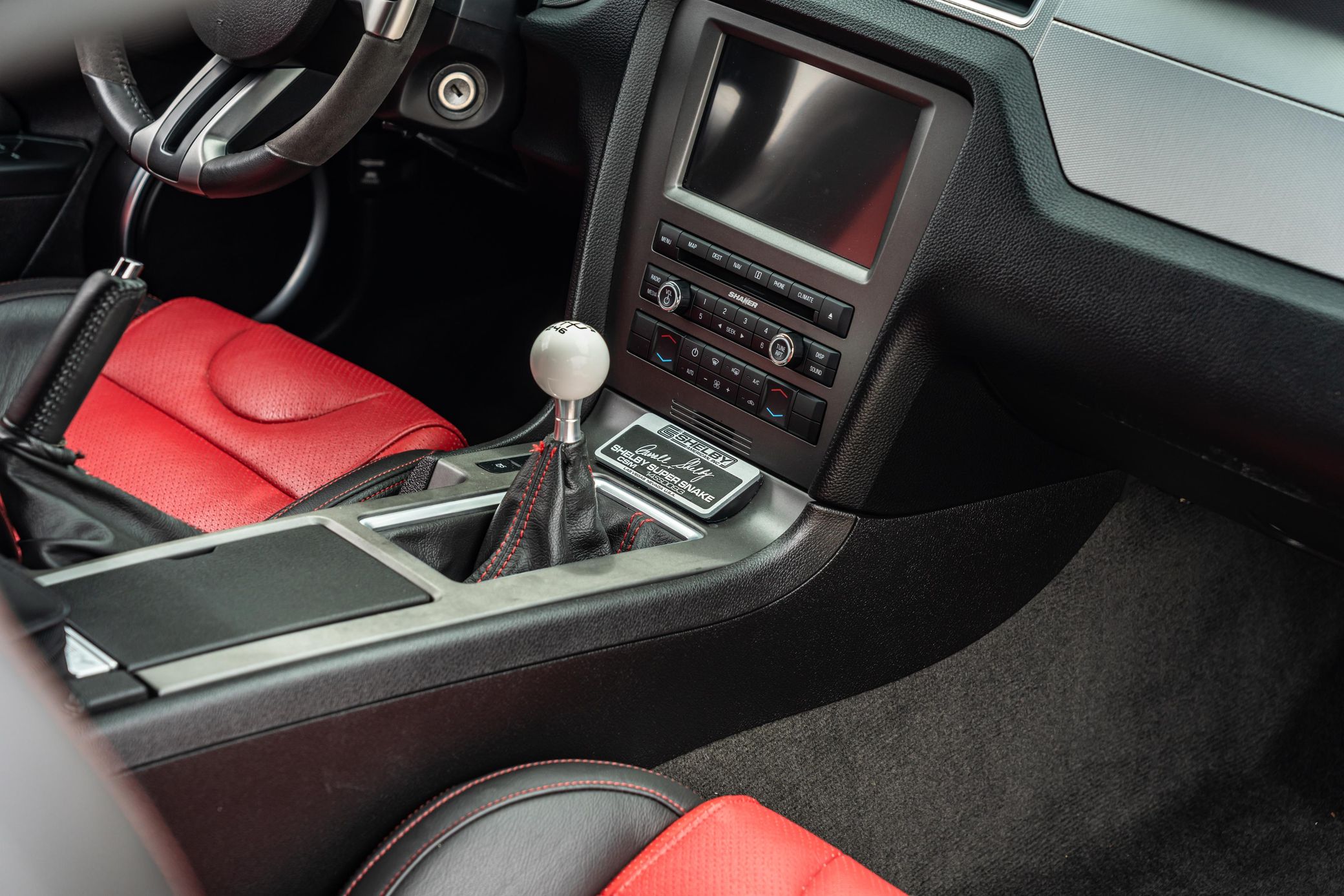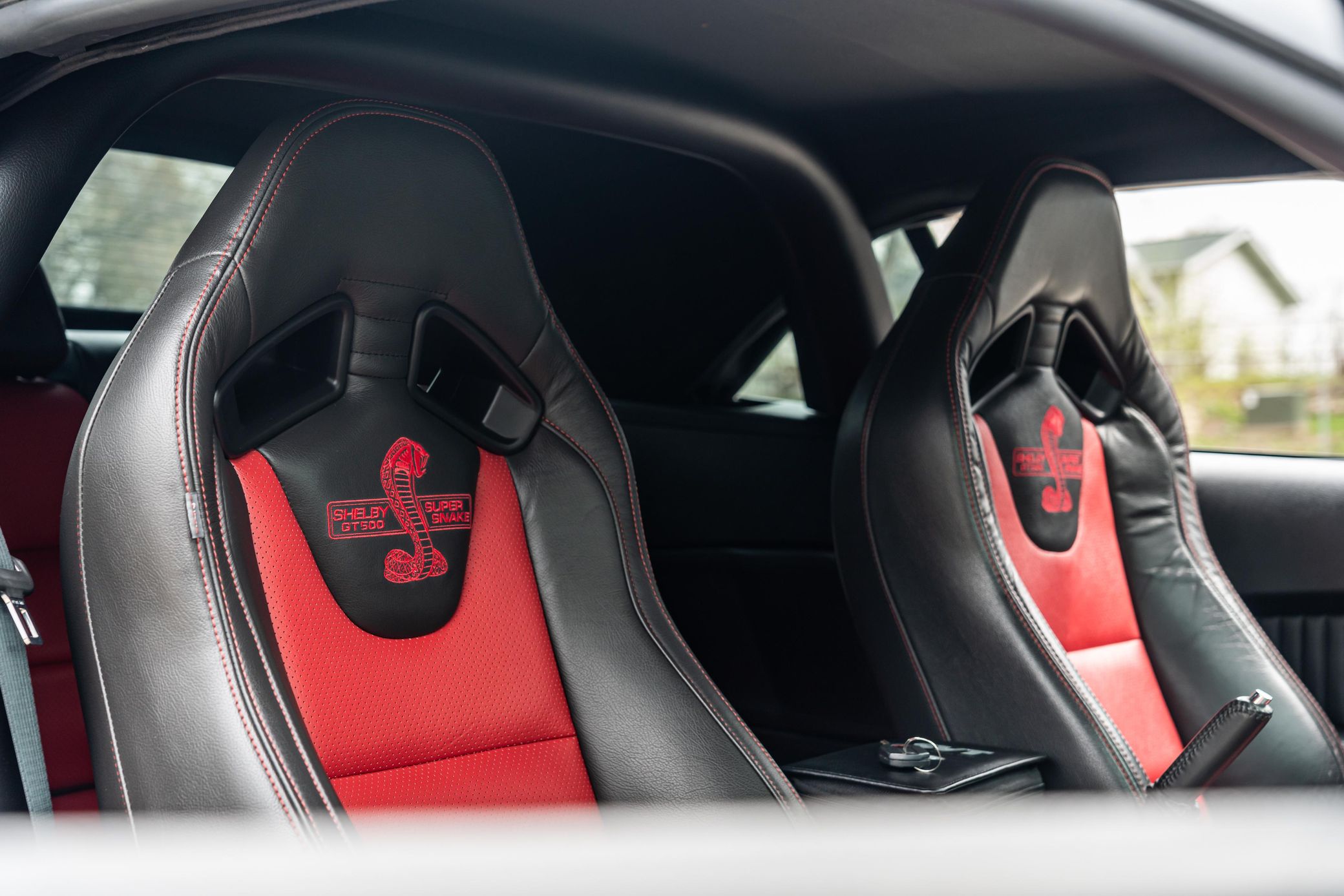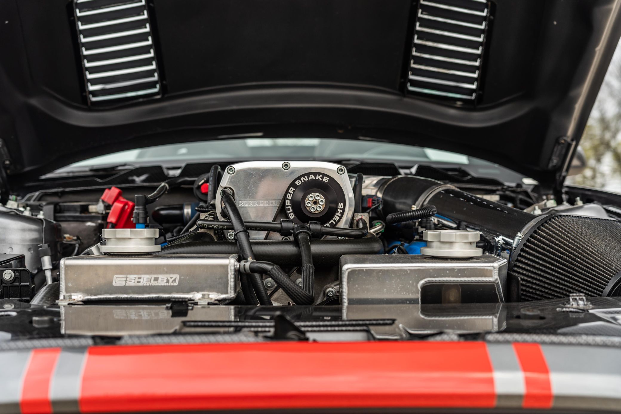 Featuring a 6-speed manual transmission, short-throw shifter, 3.73:1 differential, Shelby/Wilwood disc brakes with red calipers, matte black racing stripes, Shelby Super Snake hood scoop, A-pillar gauges in a carbon-fiber housing, Shaker audio system, and black 20-inch Shelby forged wheels wrapped in Michelin Pilot Sport tires. The wide-body kit by Shelby allows for substantial rear tire coverage.