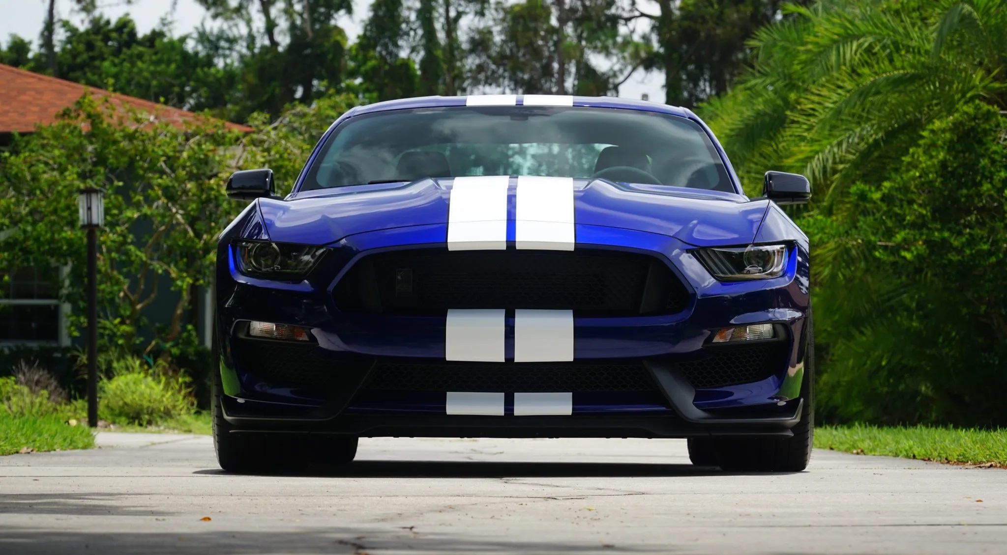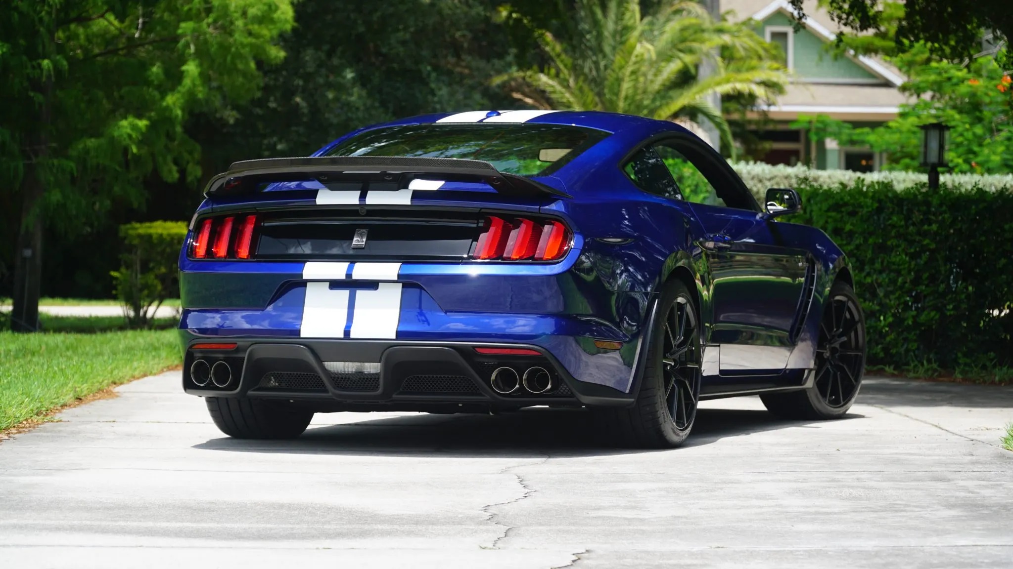 This particular 2015 Shelby GT350 Anniversary Edition is one of 50 Track Package models and one of only 17 finished in Deep Impact Blue Metallic. It was also optioned with distinctive white over-the-top stripes outlined in black. Inside, the car is equipped with Ebony Recaro racing seats and a suede-wrapped steering wheel featuring the Shelby Cobra emblem.