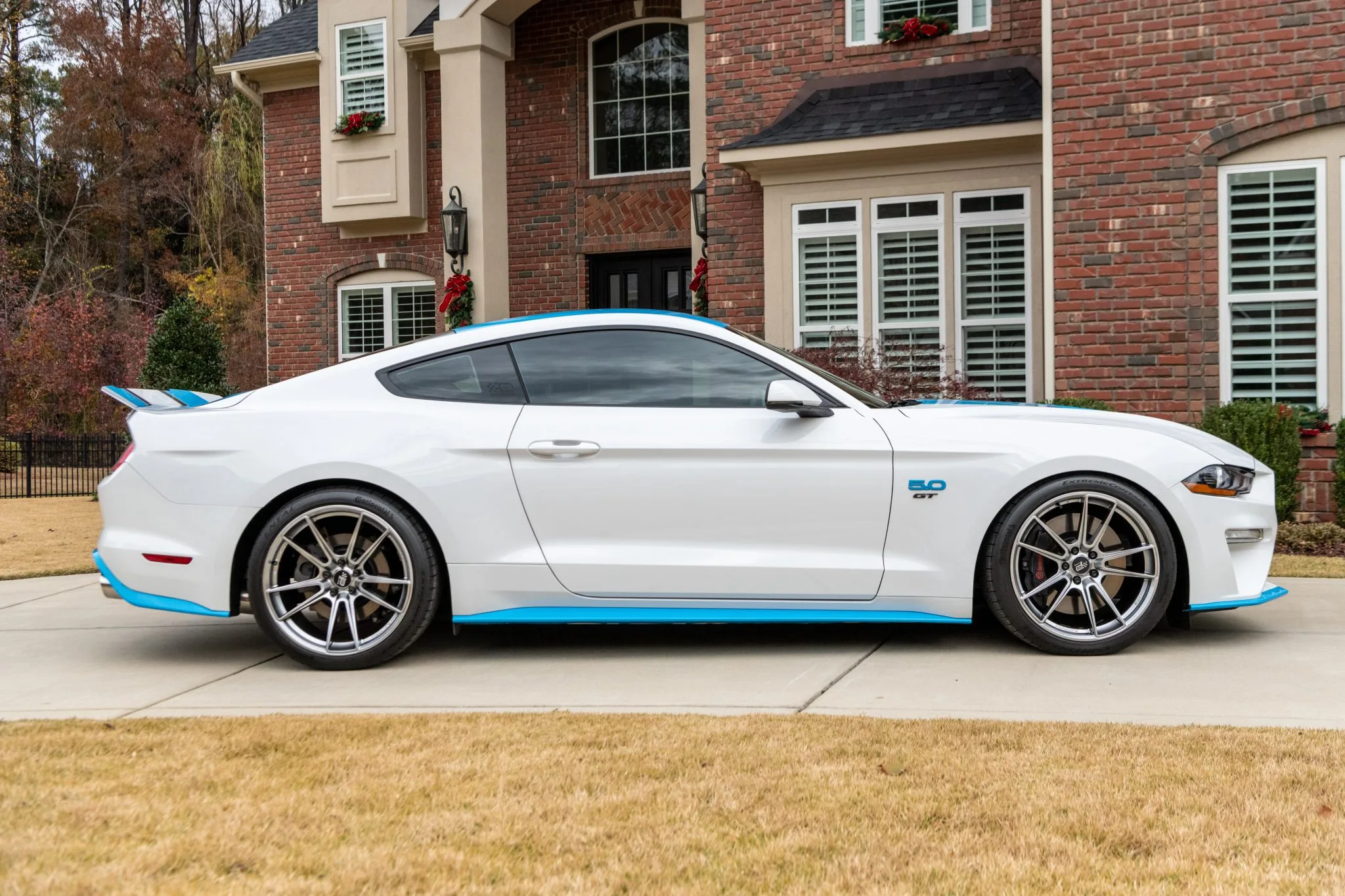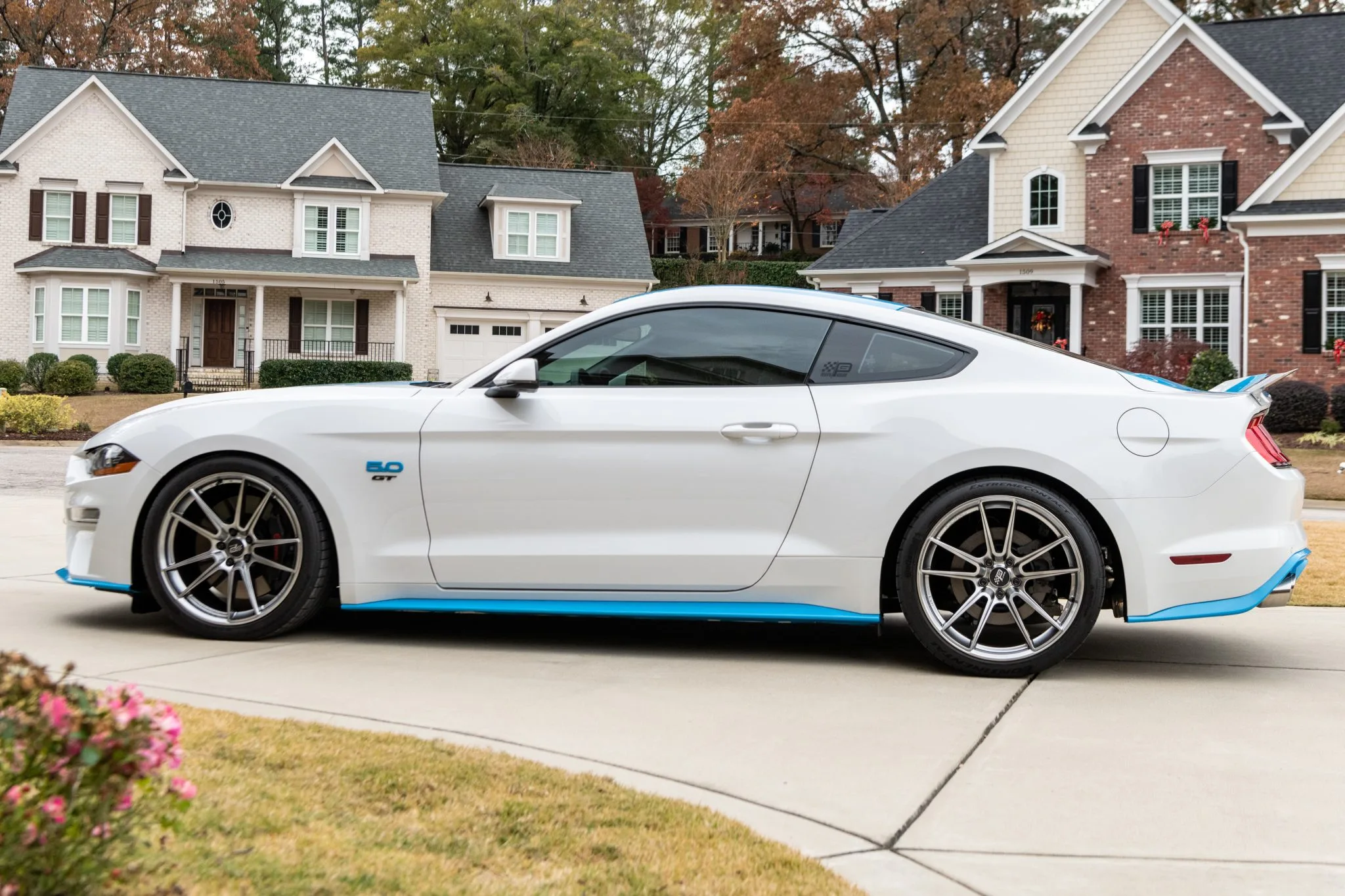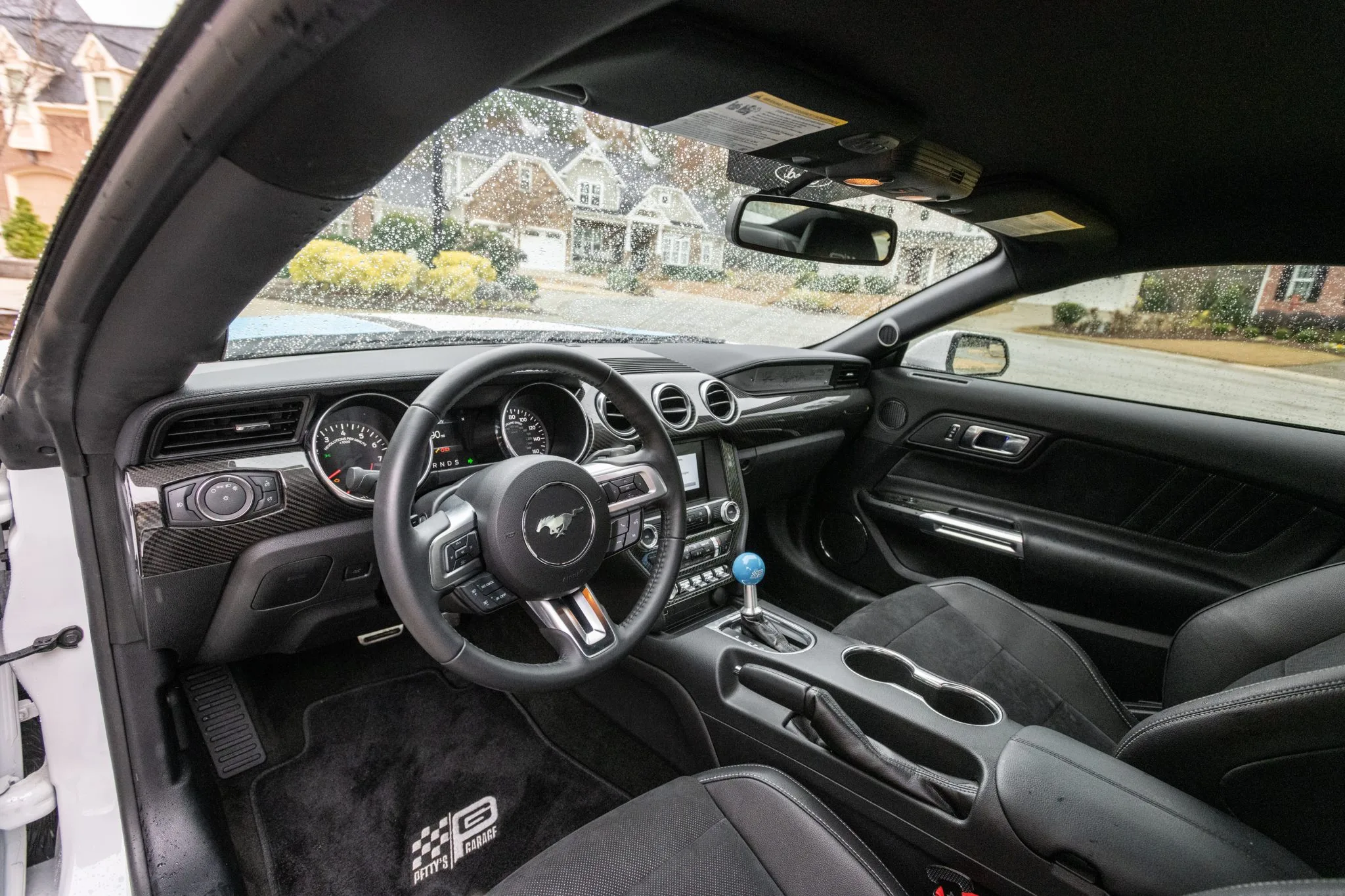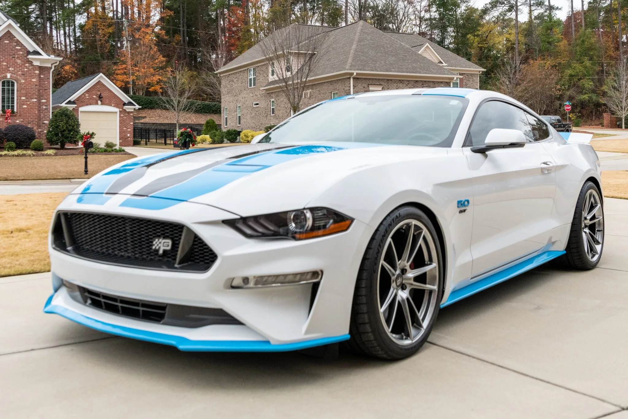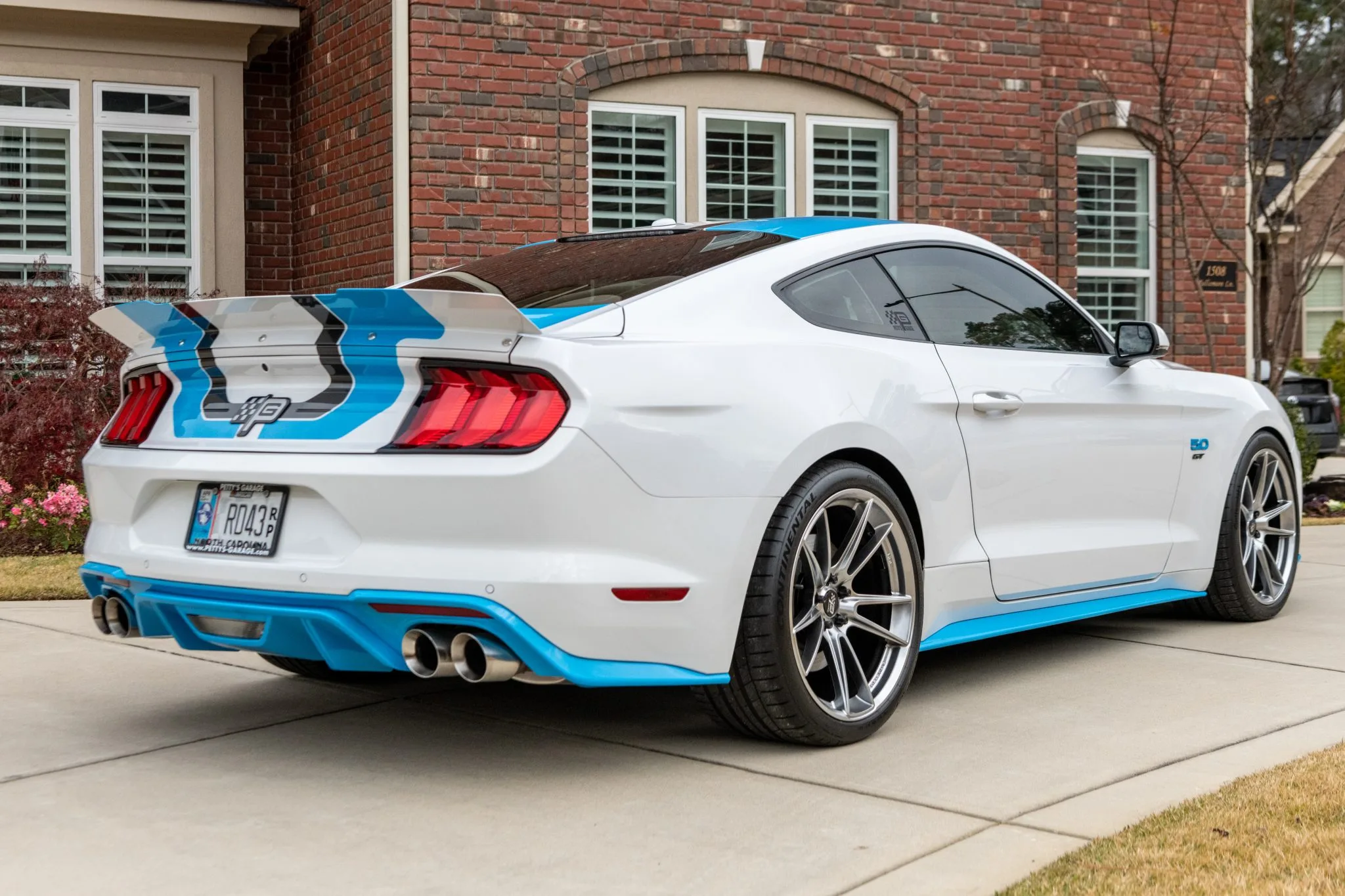 The Mustang featured here is one of the 43 King Premier Edition coupes modified by Petty’s Garage of Randleman, North Carolina. It is finished in Oxford White with black and Petty Blue accents over Ebony leather and is powered by a supercharged 5.0 Coyote V8.