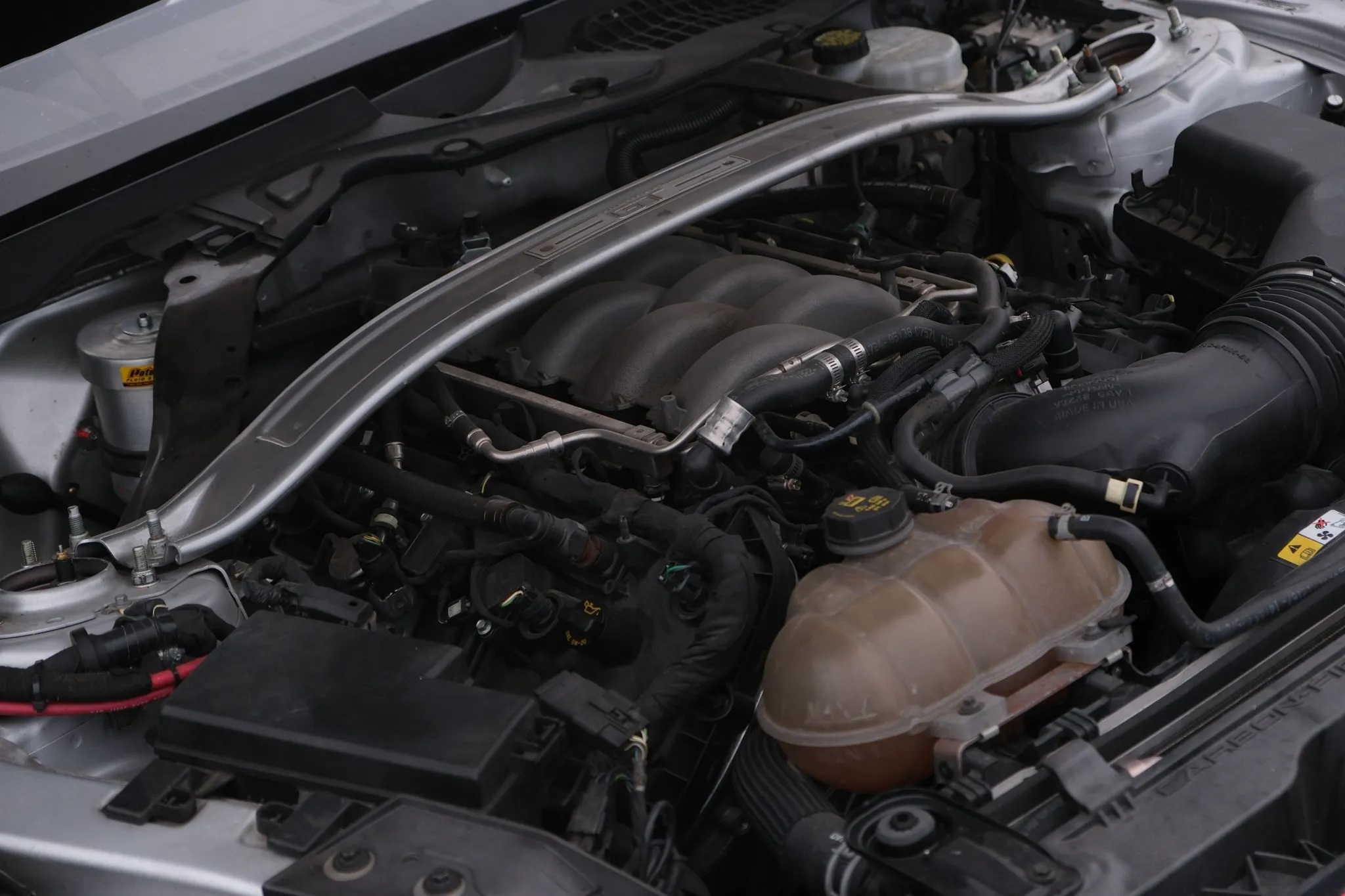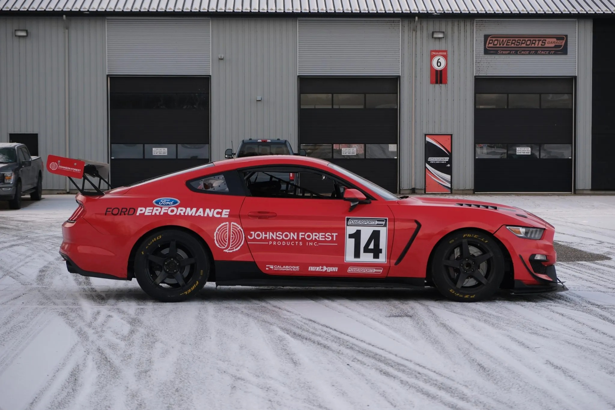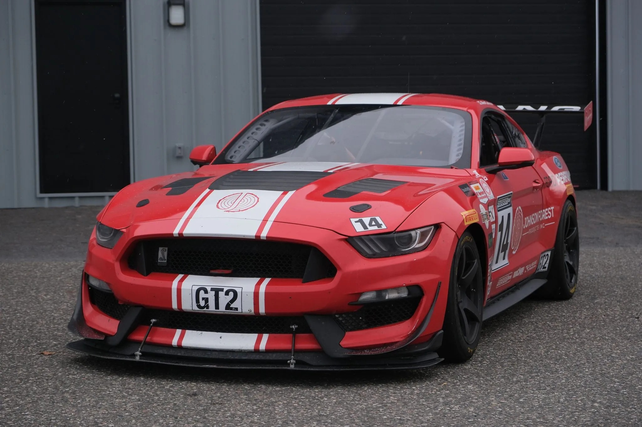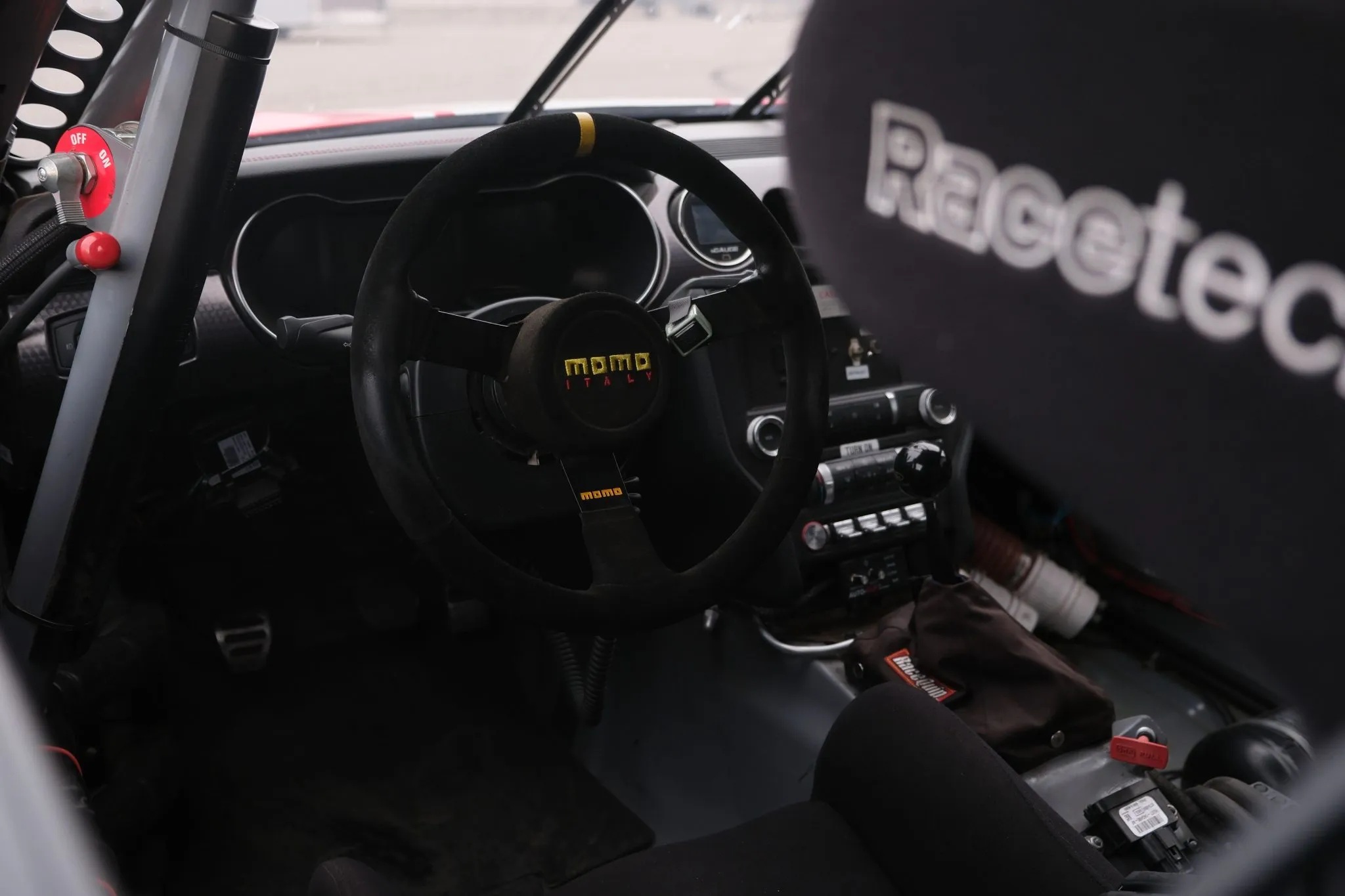 This 2018 Ford Mustang GT has been upgraded with track-focused modifications, including a roll cage, a Racetech racing seat, a Schroth multi-point harness, a quick-release MOMO steering wheel, and a fire suppression system.