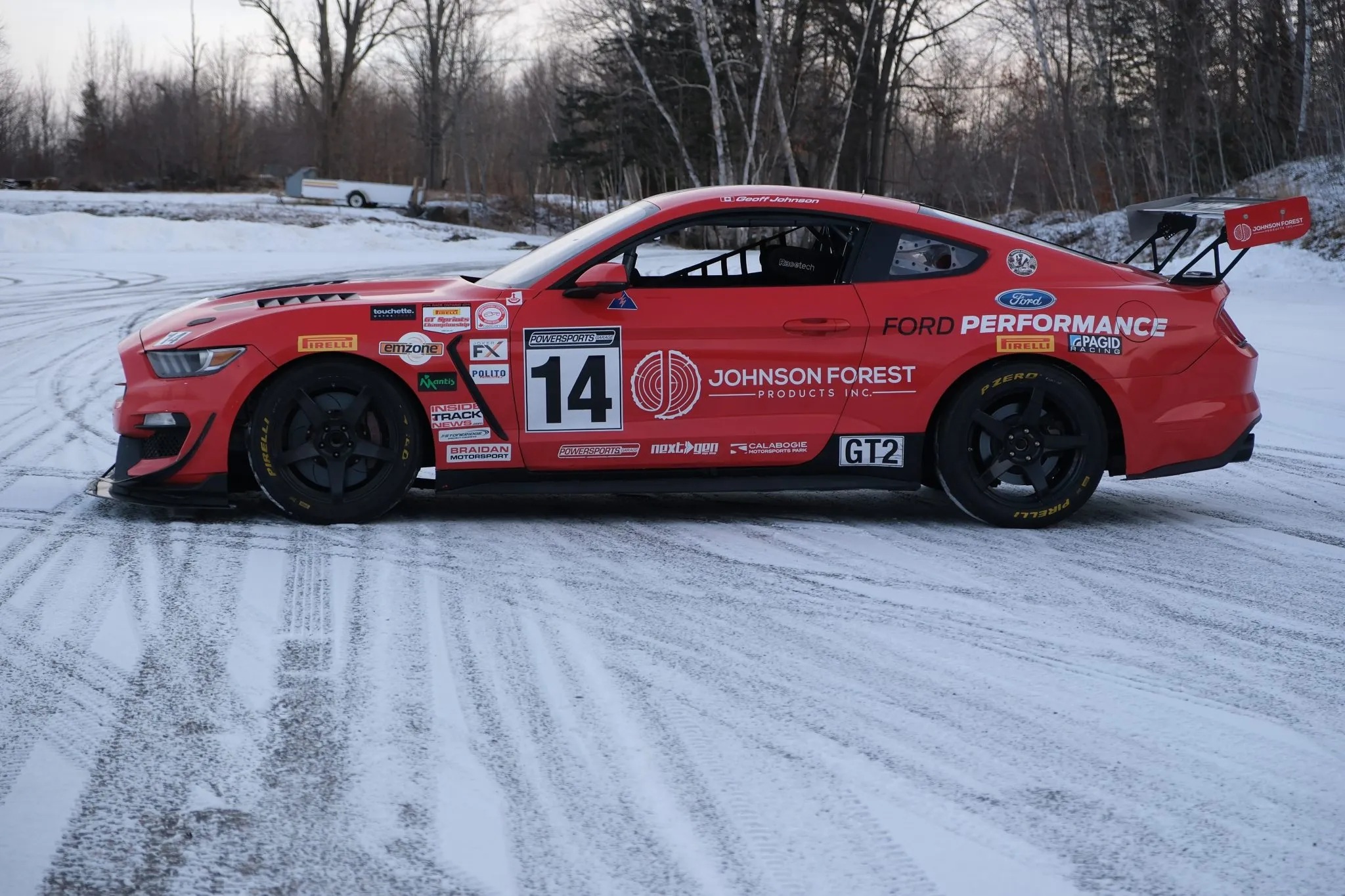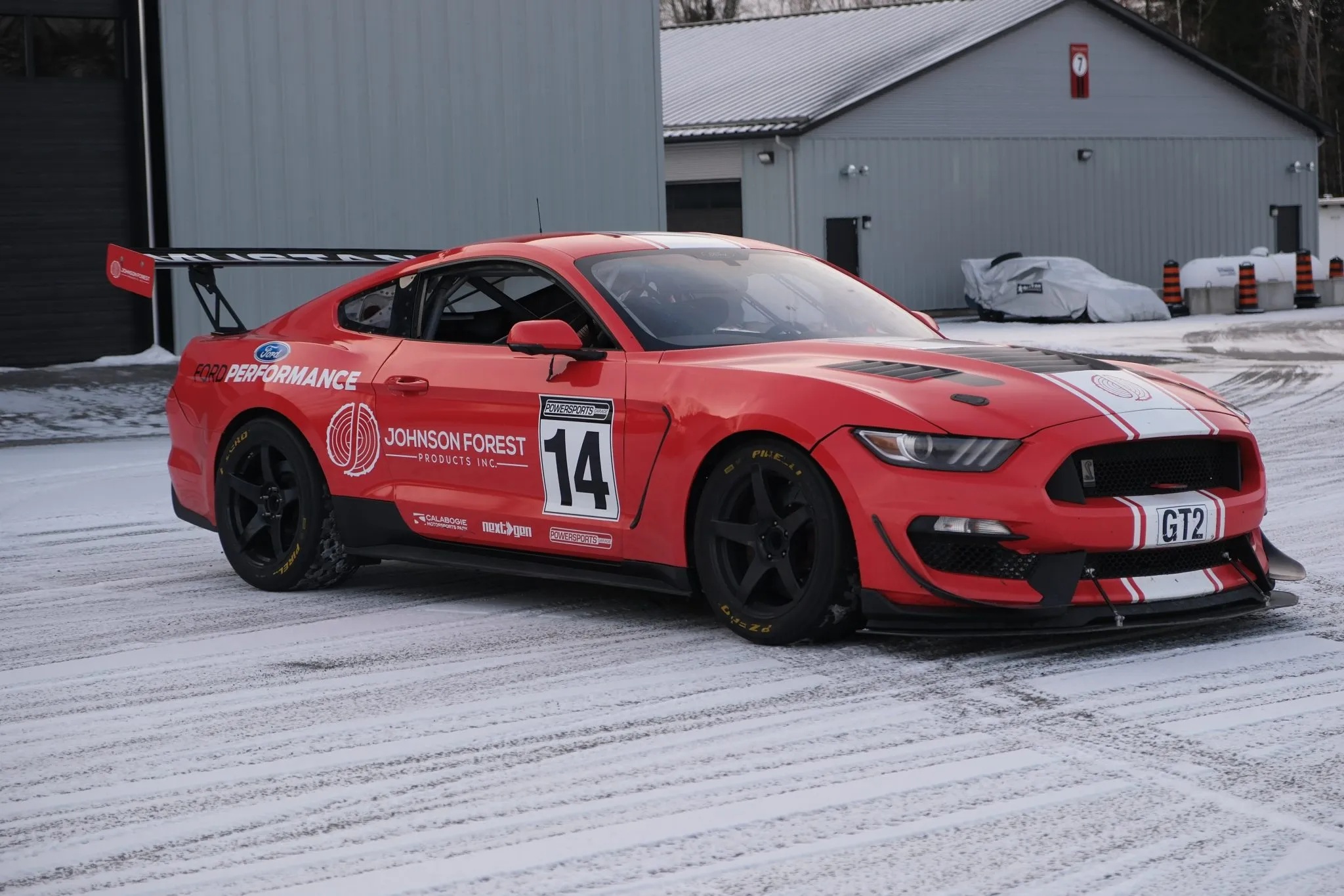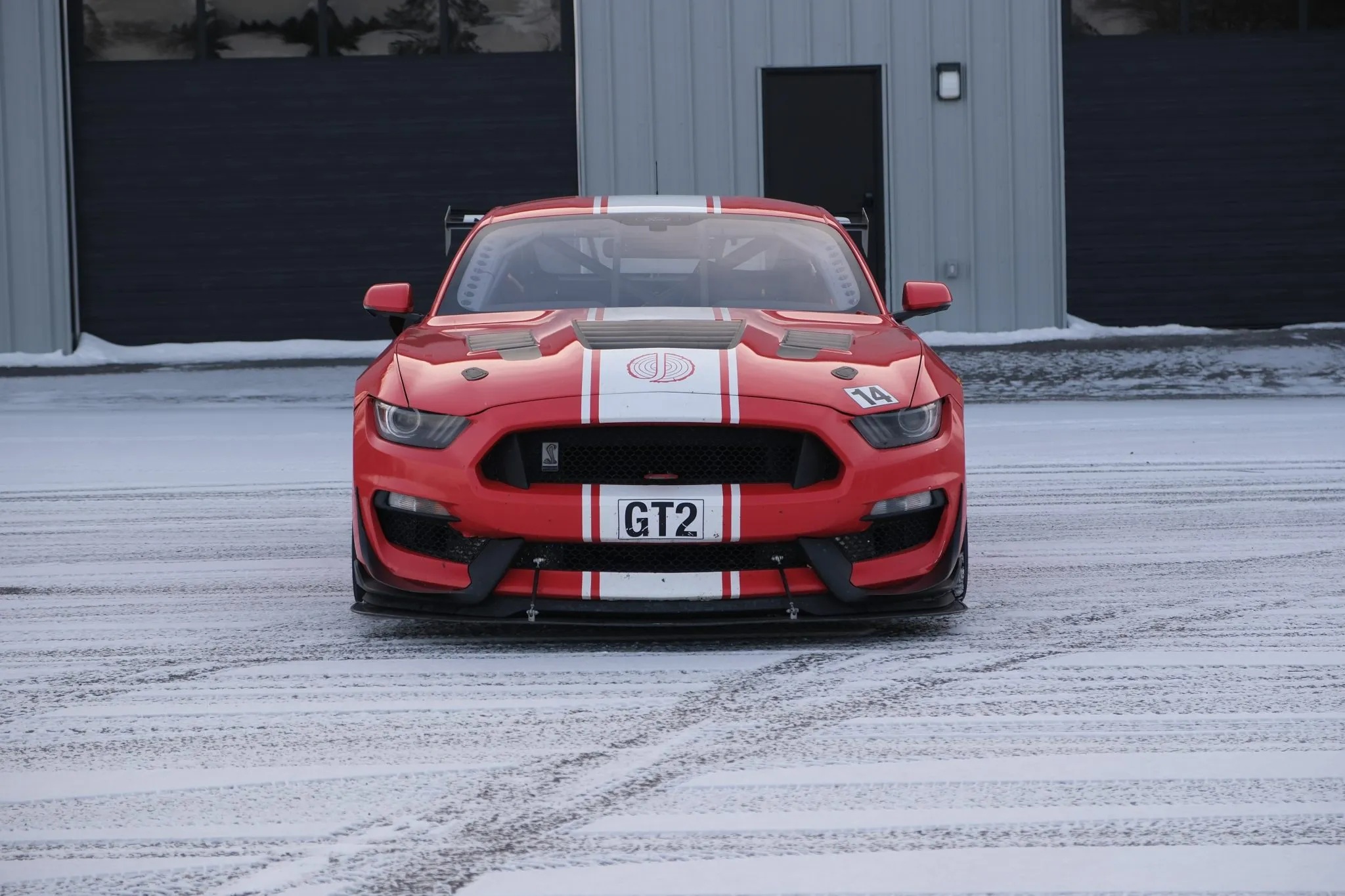The exterior is red with white over-the-top stripes and racing livery, complemented by carbon-fiber accents like the vented hood, quarter panels, front splitter, front canards, and rear wing. Under the hood, a 5.0-liter Coyote V8 engine powers the car, paired with a Tranzilla six-speed manual transmission and a limited-slip differential for optimal performance.