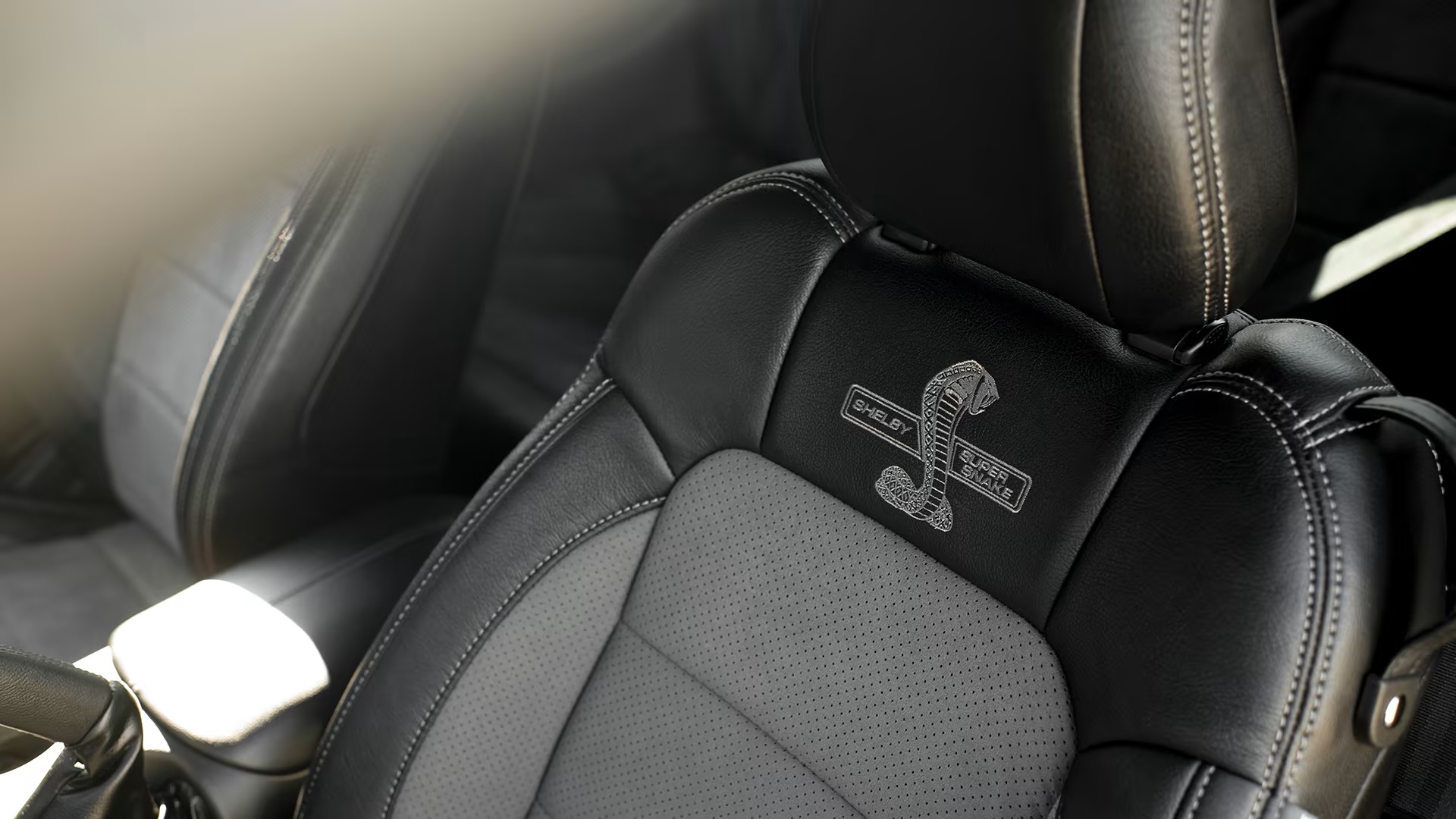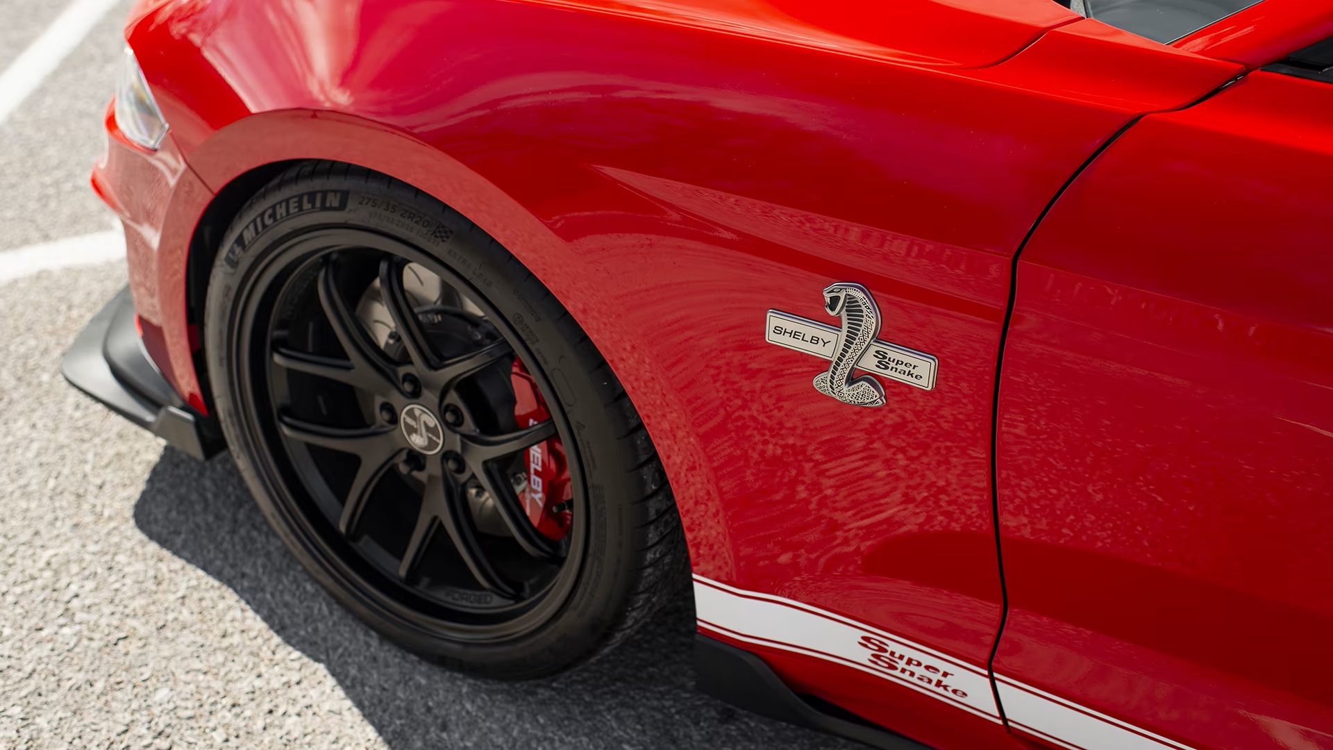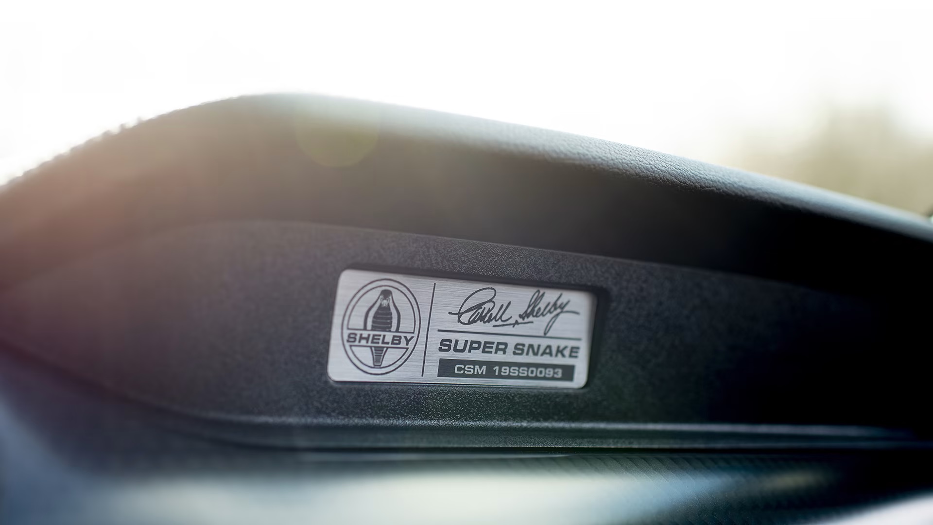 Cosmetic enhancements included a custom hood, grille, fascias, spoiler, rockers, and new “Bold” paint schemes like Shadow Black/Green Stripes. The car also sported 20” forged aluminum wheels in “Black” or “Bright” finishes. Inside, the Super Snake featured signature-series floor mats, door sill plates, a Shelby authenticity placard, and Katzkin seats with custom stitching that matched the exterior color.