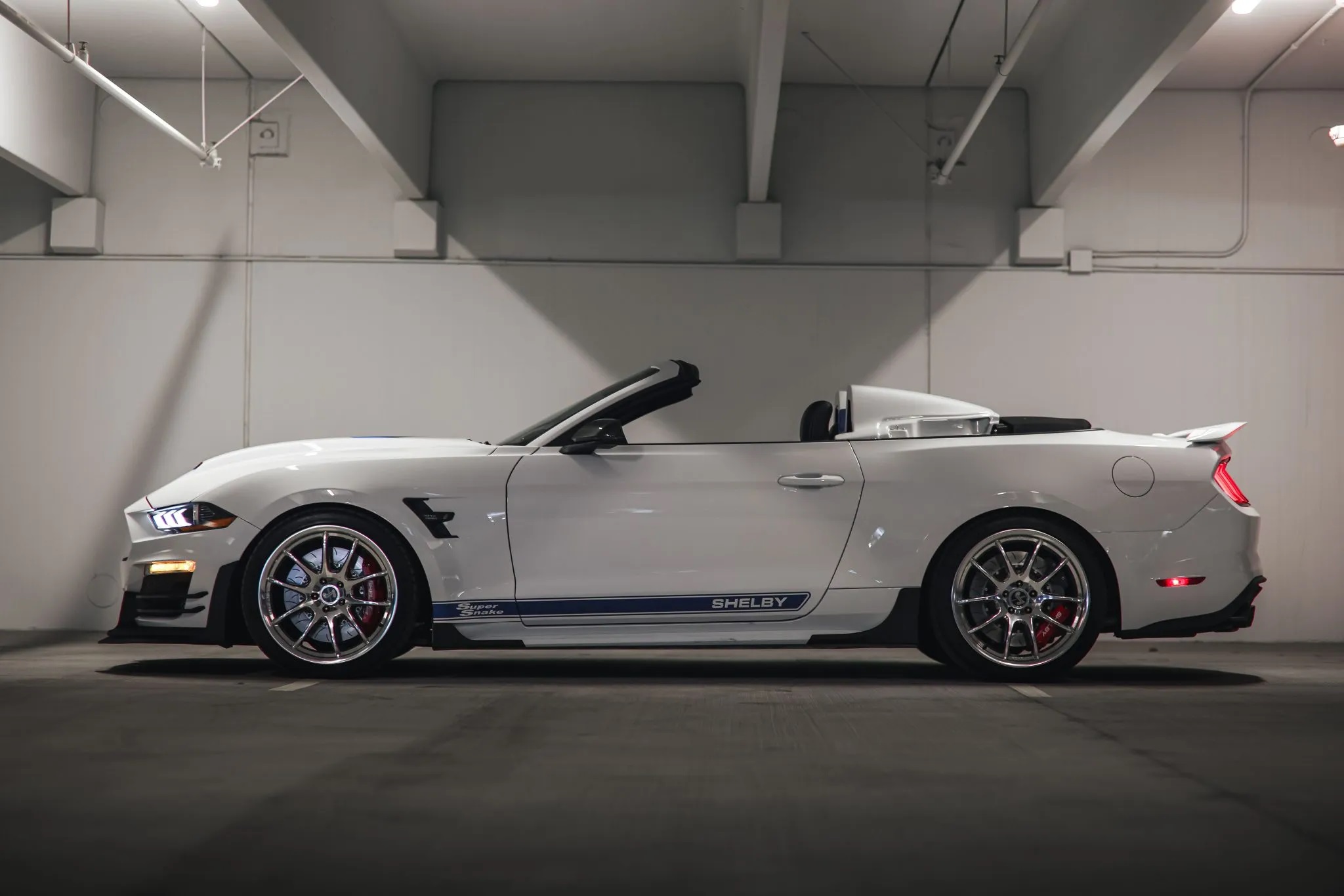 In its speedster configuration, the Super Snake becomes a strict two-seater, featuring a customized tonneau cover over the rear. The Super Snake also receives a widebody aerodynamic kit, a Shelby suspension package and Brembo brakes, 20” forged aluminum Shelby wheels, and a Shelby-spec interior upgrade.