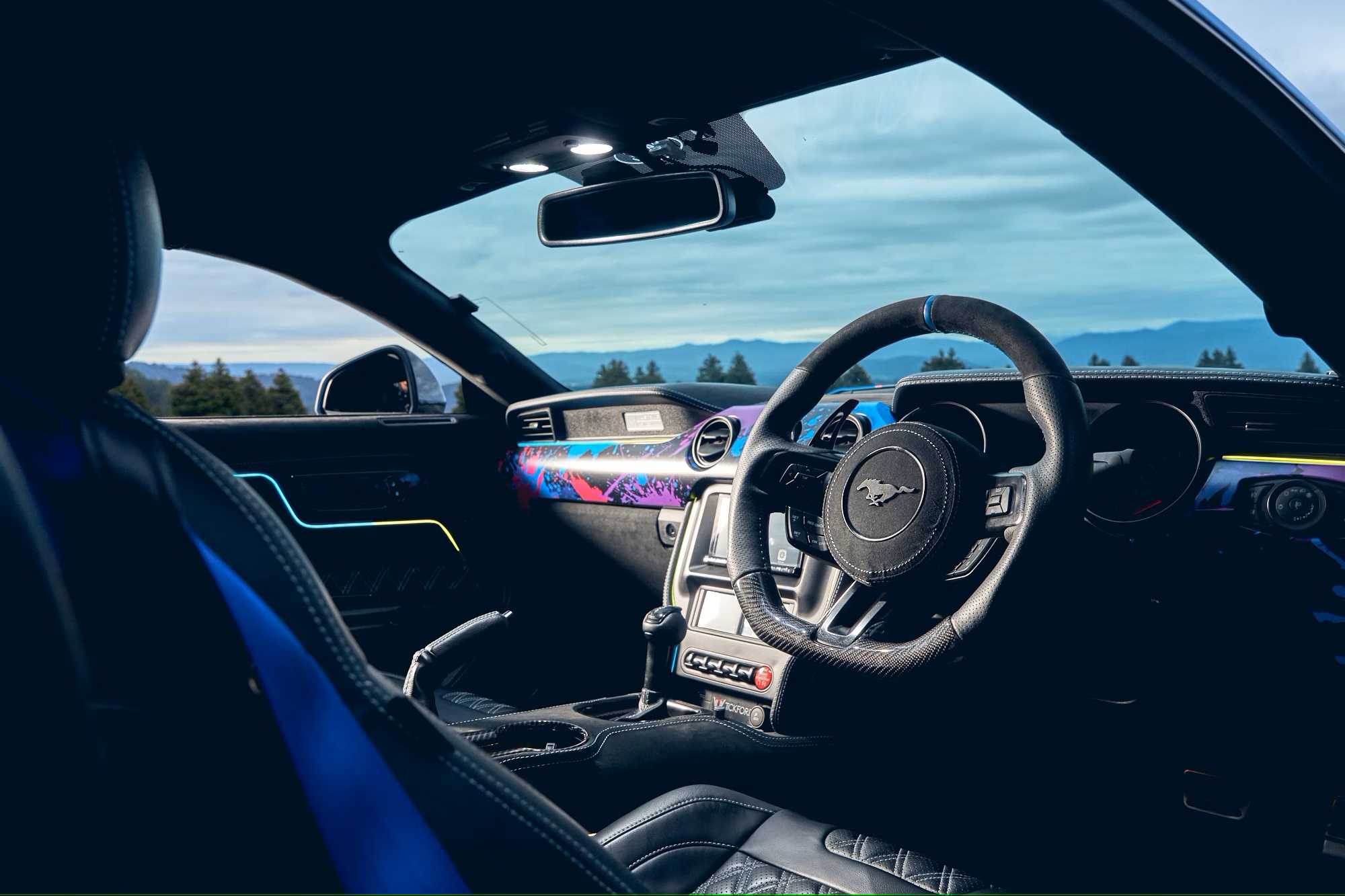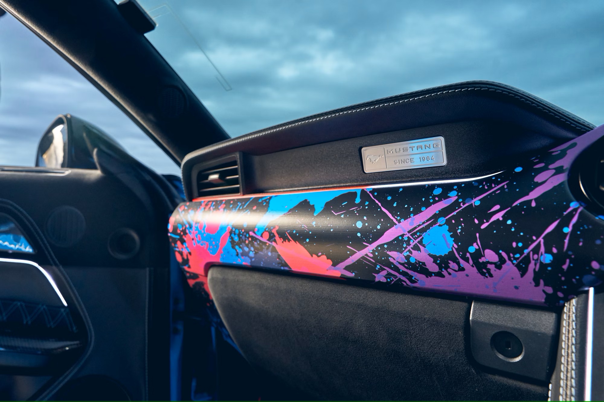 Inside, the cabin is retrimmed with black leather and Alcantara upholstery, featuring diamond-quilted inserts, blue seat belts, and Mustang emblems embossed on the front headrests. Carbon-fibre accents and a paint splatter-effect dashboard further elevate the interior’s design.