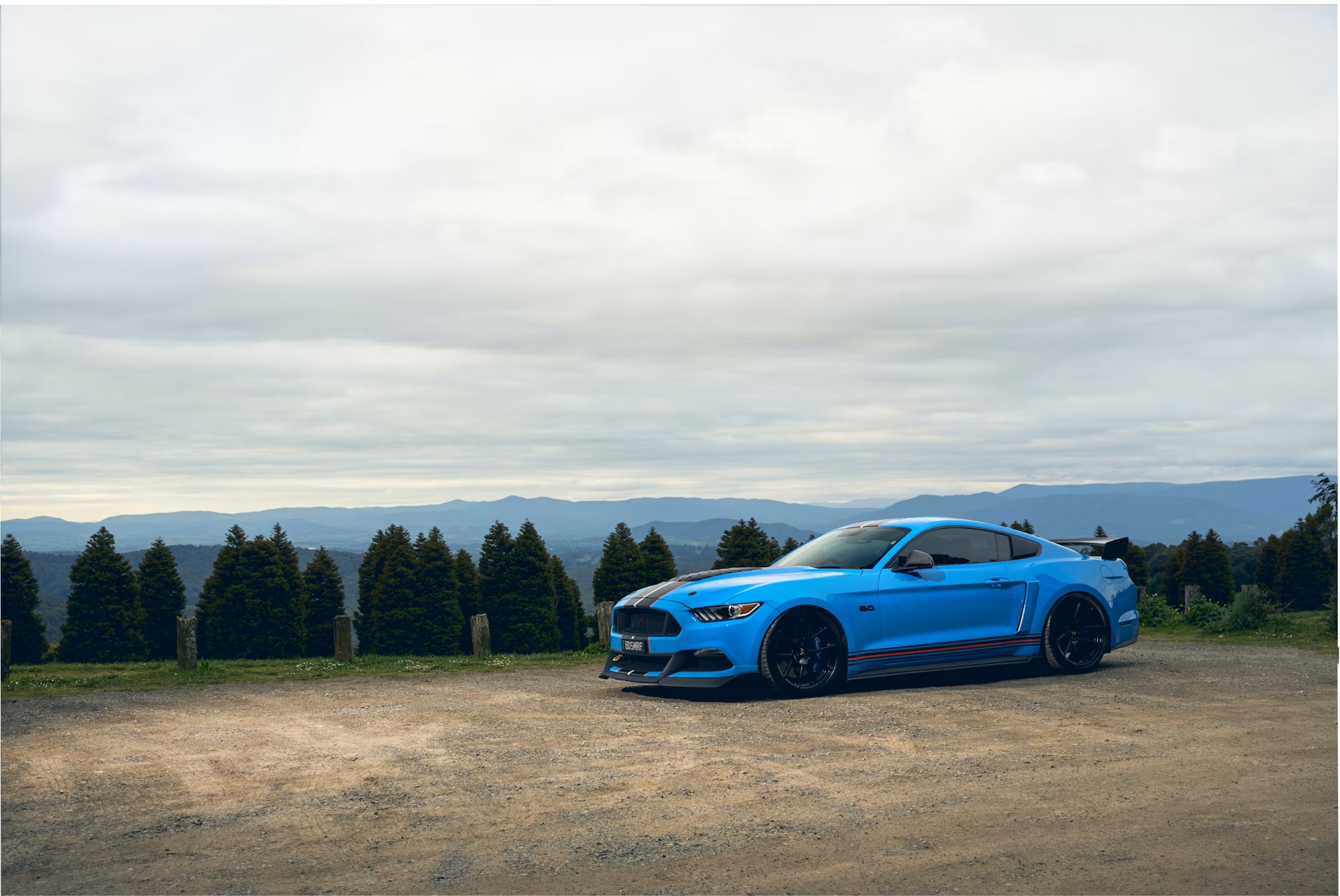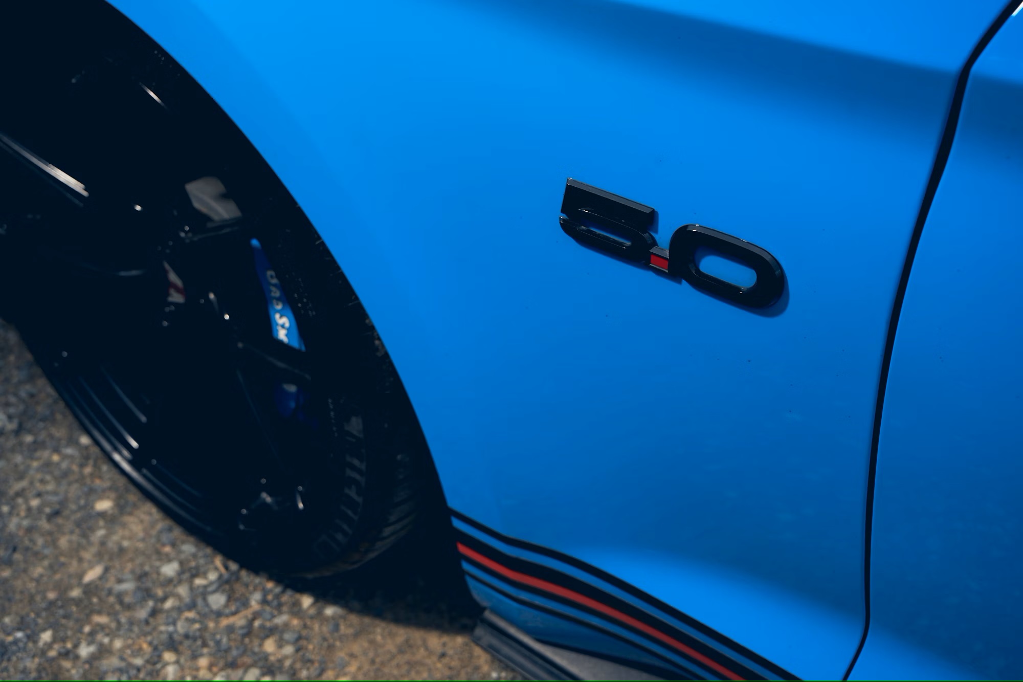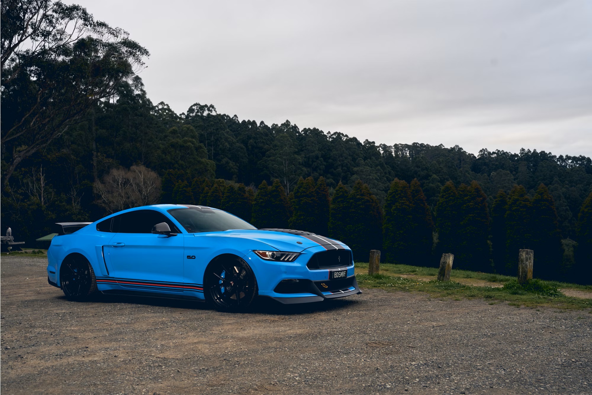 The Mustang is finished in Grabber Blue with contrasting matte black, red, and white racing stripes, along with black and red side stripes. Additional upgrades include a ‘GT’ front bumper, side skirts, rear diffuser, carbon-fibre door mirror caps and rear spoiler, smoked tail lights, and tri-bar front lights with adjustable colors. It ride on 20-inch gloss-black Tickford Y-spoke alloy wheels with blue ‘Bad Smurf’-branded brake calipers and Michelin Pilot Sport 4S tires.