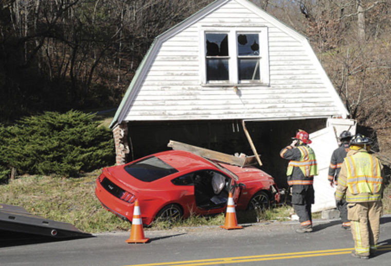 A 22-year-old test-driving a new 2015 Ford Mustang GT lost control and crashed into a West Virginia garage landing on a vintage 1948 Dodge coupe. The driver of the Mustang told police the vehicle began fishtailing when he lost control and hit the building. From the photo it looks like the new Mustang is totaled.