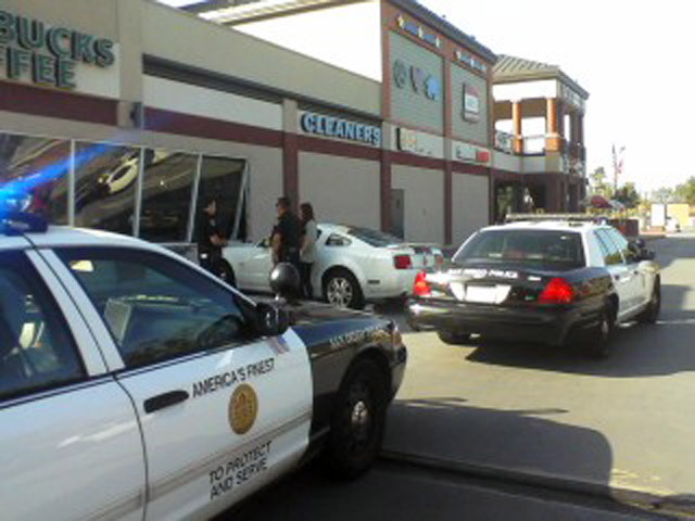 A 20-year-old female Mustang driver tried to make her own drive-thru at Starbucks in Mission Valley, California yesterday as she crashed. She struck the side of the building as two patrons were sitting at a table enjoying their coffee. Fortunately for them they saw the Mustang coming and had time to get out of the way.