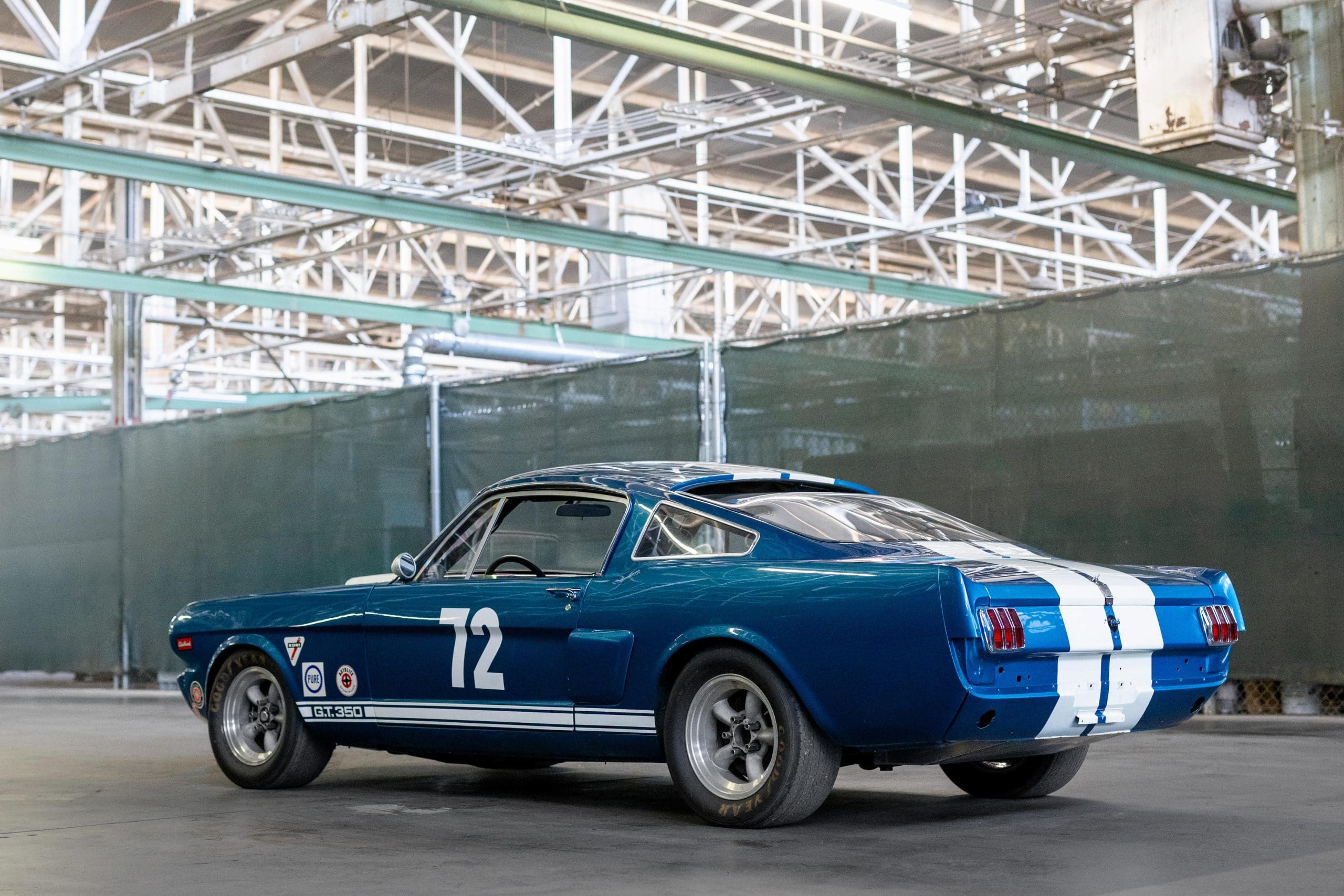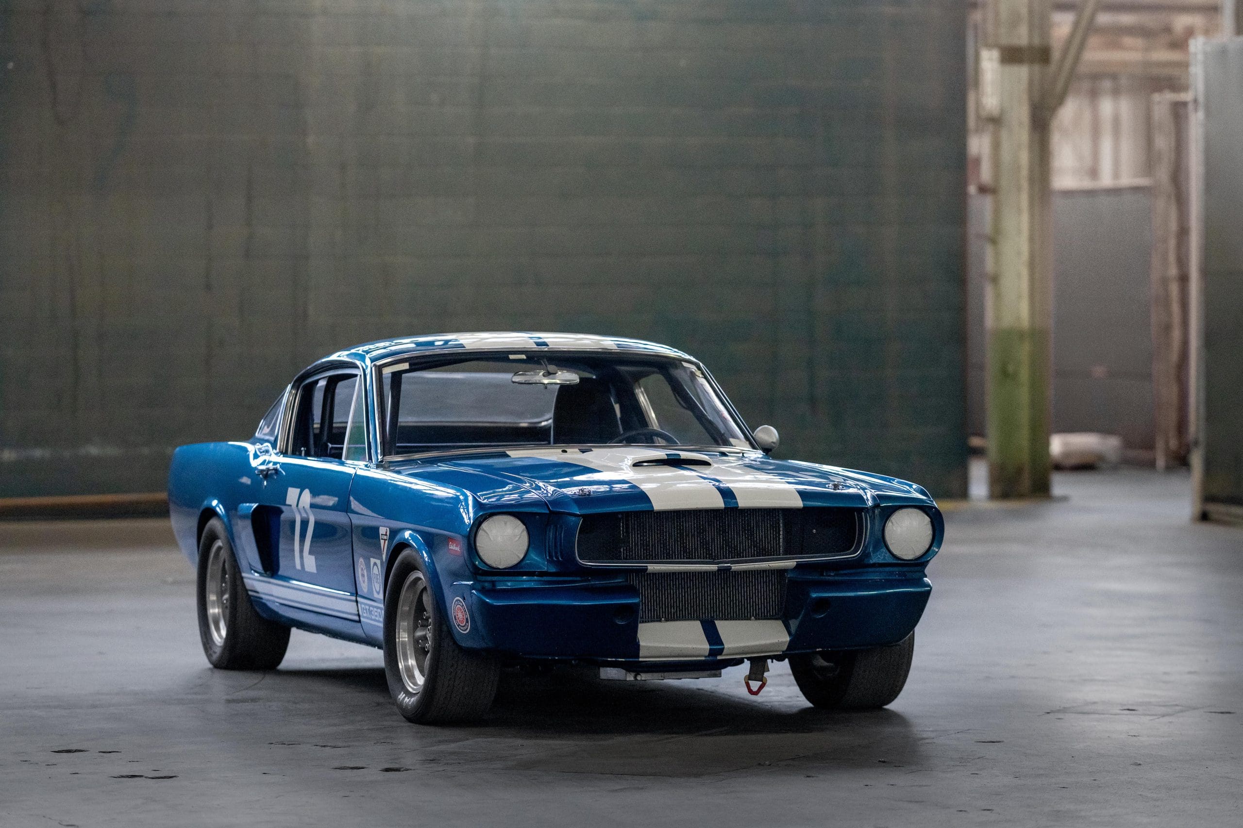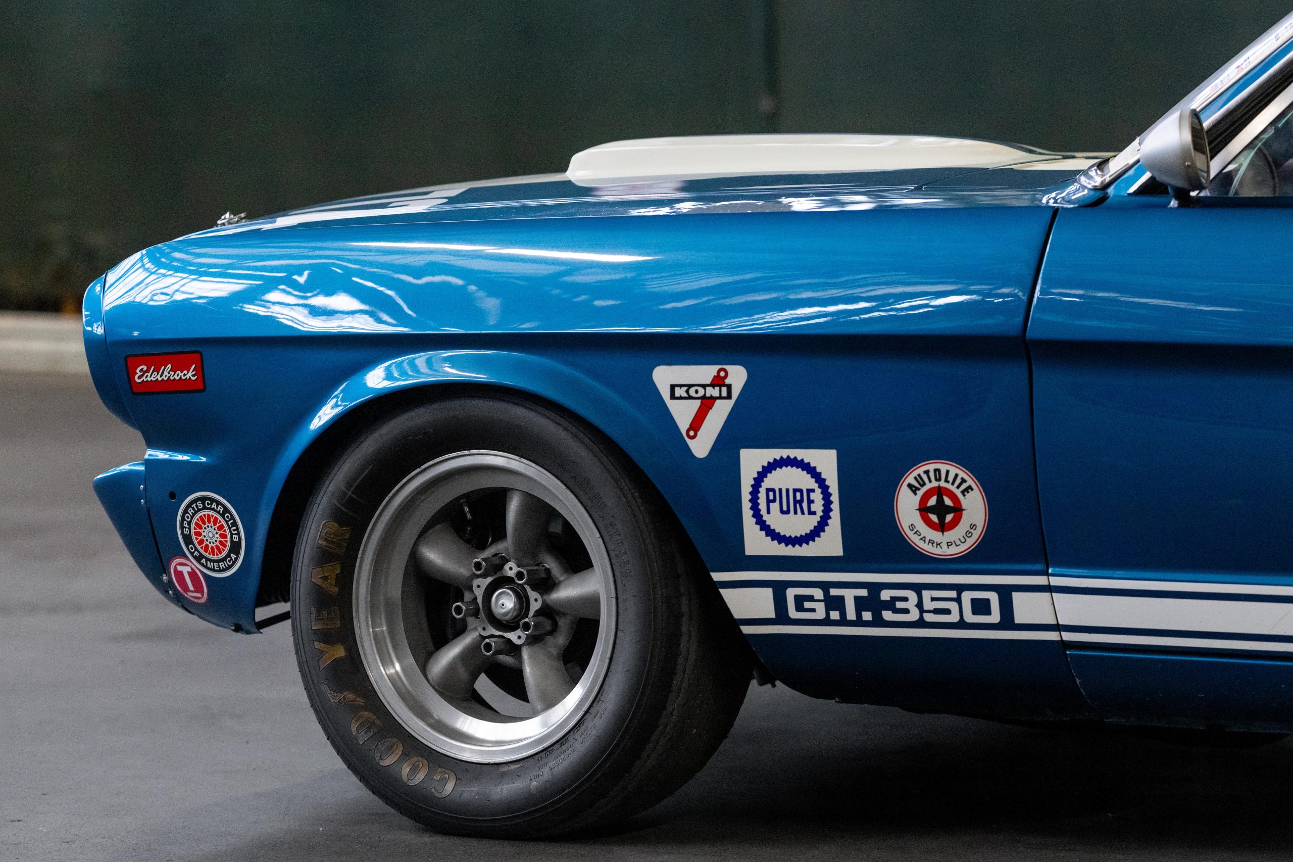 The car later passed through notable owners, including Shelby expert Craig Conley and Arthur Miller, who acquired it in 1998. Under Miller’s ownership, it was converted to GT350 R-Model specifications for vintage racing, featuring a roll cage, fiberglass front apron, brake-cooling side scoops, grey Torq-Thrust wheels, and a lightweight Plexiglas rear screen.