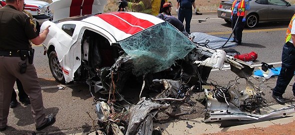 We hate to see vehicle carnage like this but its not everyday you get to see a Shelby GT500 totally destroyed by a maniac driver hitting a concrete bridge support. The female driver of the 2008 Shelby GT500 was clearly driving to fast for the conditions as she tried to avoid on-coming traffic only to lose control, spin-out and hit the concrete bridge support head-on. Parts were sent flying including the 5.4-liter V8 engine that ended up in on-coming traffic which was hit by another car. One of the doors, a wheel and part of the frame landed a good 30 yards away.