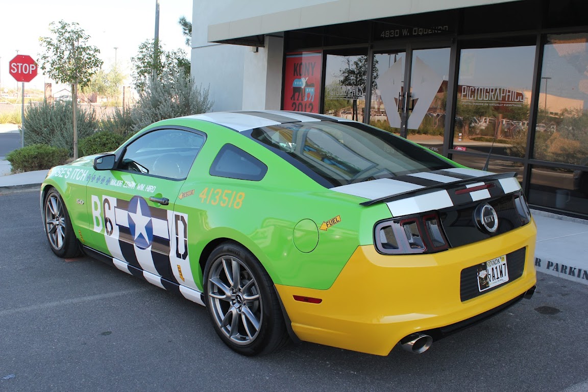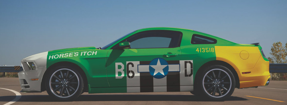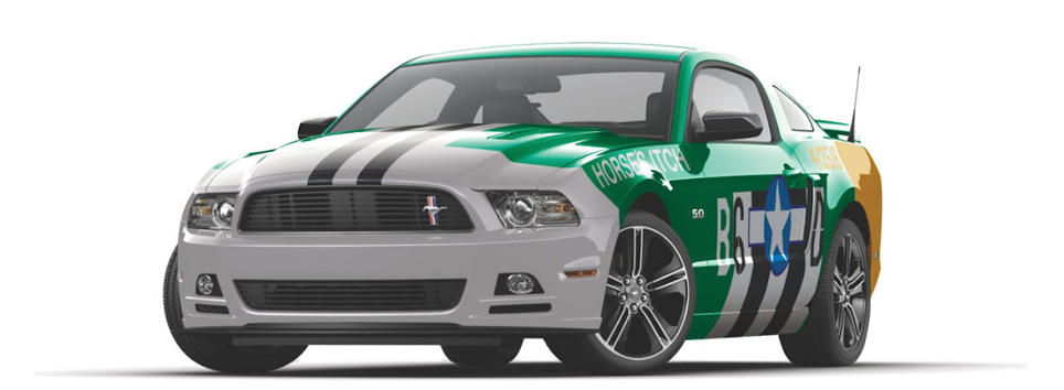 At this years SEMA show the Track Fighter Mustang will make its debut courtesy of Pictographics using Avery Dennison’s supreme wrapping film. For this project Pictographics decided to use the the 2013 Mustang as its platform with inspiration coming from a WWII D-day Invasion paint scheme typical of the P-51 Mustang fighters. The detailed graphics were chosen from Major Edwin W. Hiro’s P-51-D airplane named “Horses Itch”.