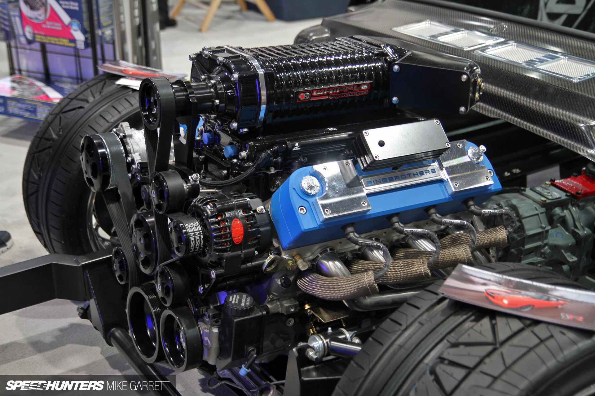 For this years SEMA show the Ring Brothers brought two completely custom built Mustangs, one is the NASCAR powered 1965 Mustang Blizzard and the other is this Pro Touring beast. Its a special Mustang for many reasons but one in particular has us amazed as the body panels are completely made out of carbon fiber. The fenders, doors and quarter panels are also widened 2-inches to accommodate larger wheel sizes.