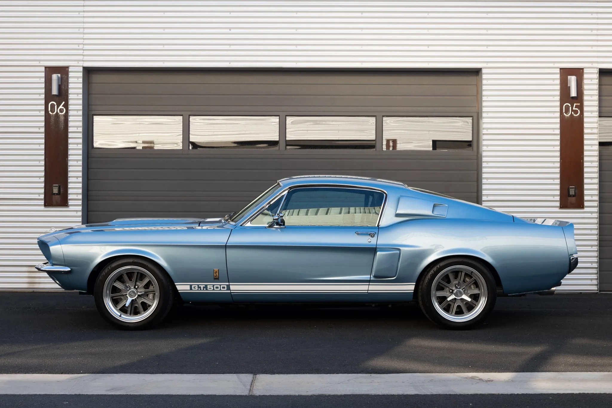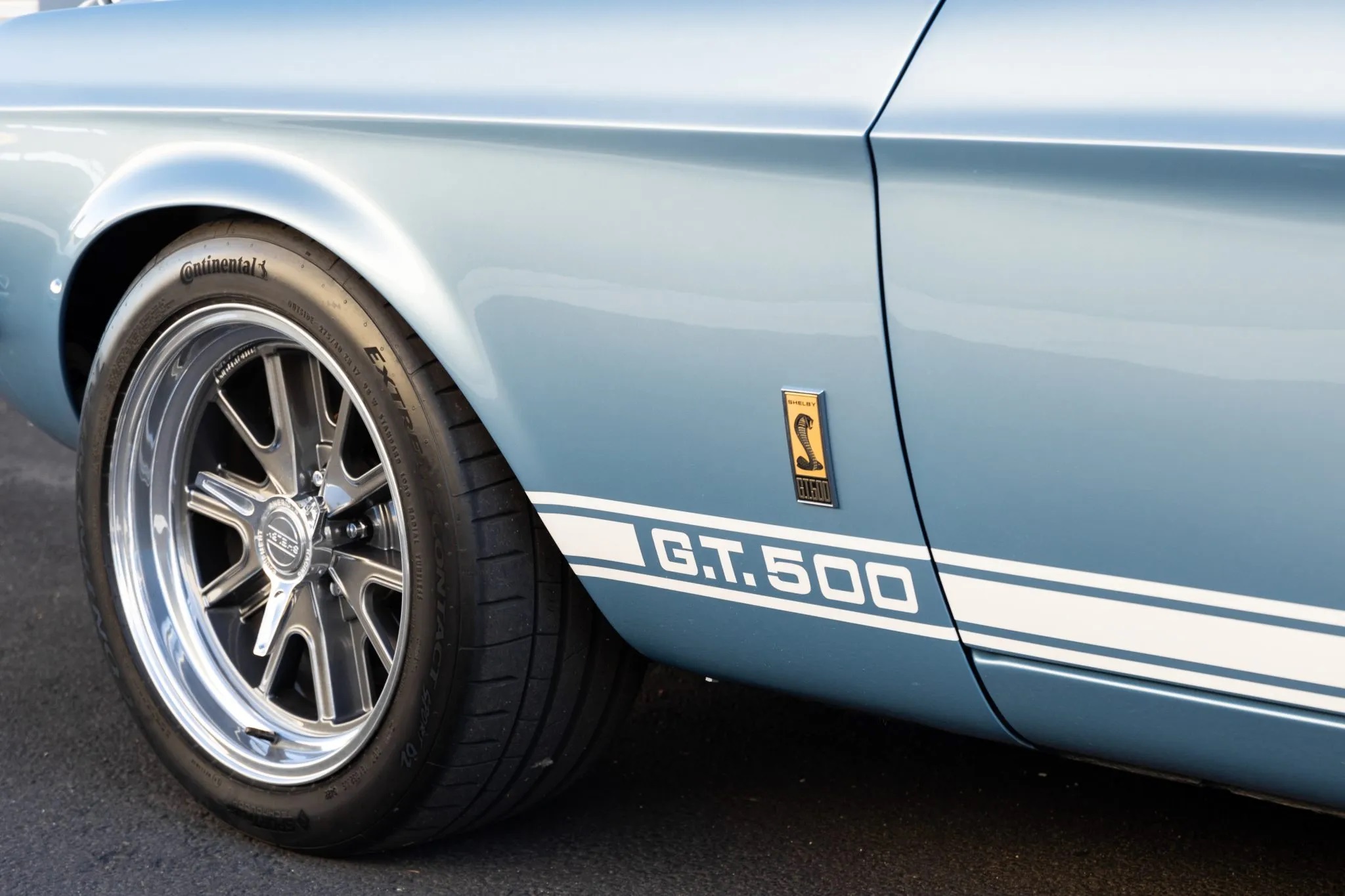 This particular Shelby Mustang GT500 fastback, designated as production #147 in the Revology registry, was completed in 2023. It boasts a Brittany Blue Metallic finish accented by Wimbledon White over-the-top stripes, along with vinyl side stripes.