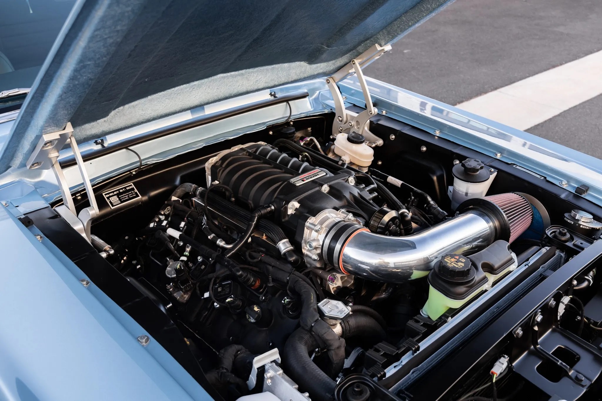 Power comes from a supercharged 5.0-liter Roush Performance Coyote V8, delivering 710 horsepower and 610 lb-ft of torque. It is paired with a Tremec six-speed manual transmission, a carbon-fiber driveshaft, and an 8.8-inch limited-slip rear differential.