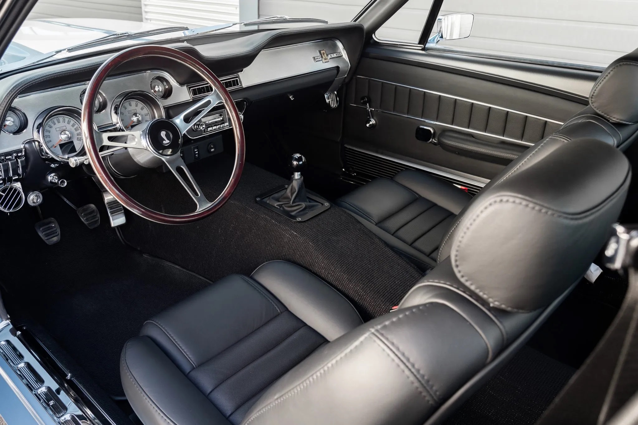 The interior is trimmed in black Nappa leather, offering modern conveniences like air conditioning, remote keyless entry, push-button start, a backup camera, a JL Audio sound system, and power-operated windows. Additional features include a Borla exhaust, LED exterior lighting, 17-inch American Racing Shelby Cobra wheels, and a Wilwood four-wheel disc brake system.