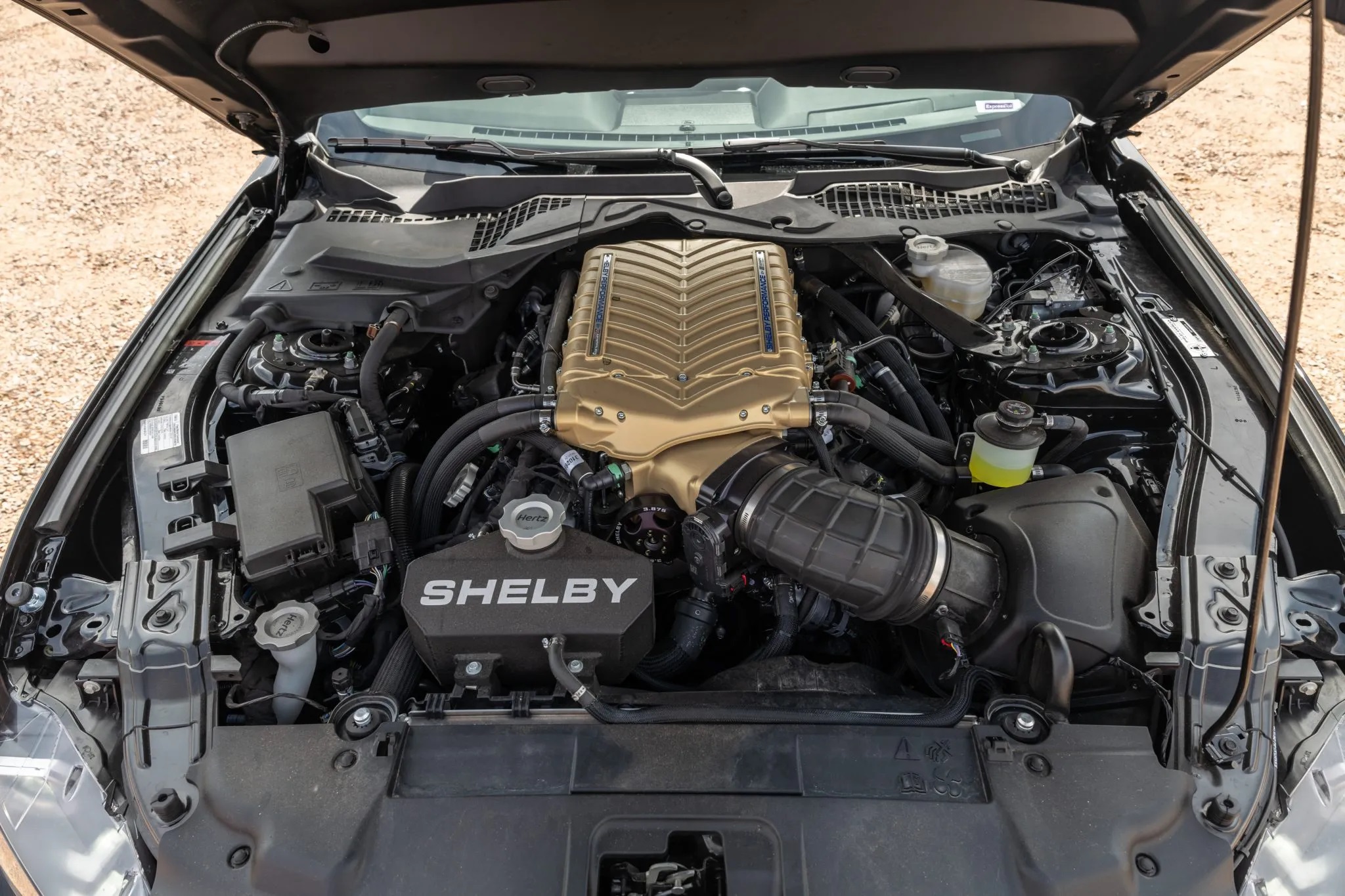 Underneath the hood lies a gold-painted Whipple/Shelby supercharger, significantly boosting the car’s power. Ford’s reliable automatic transmission and robust G-Force half shafts, capable of handling 1,500 HP, ensure optimal drivetrain performance.