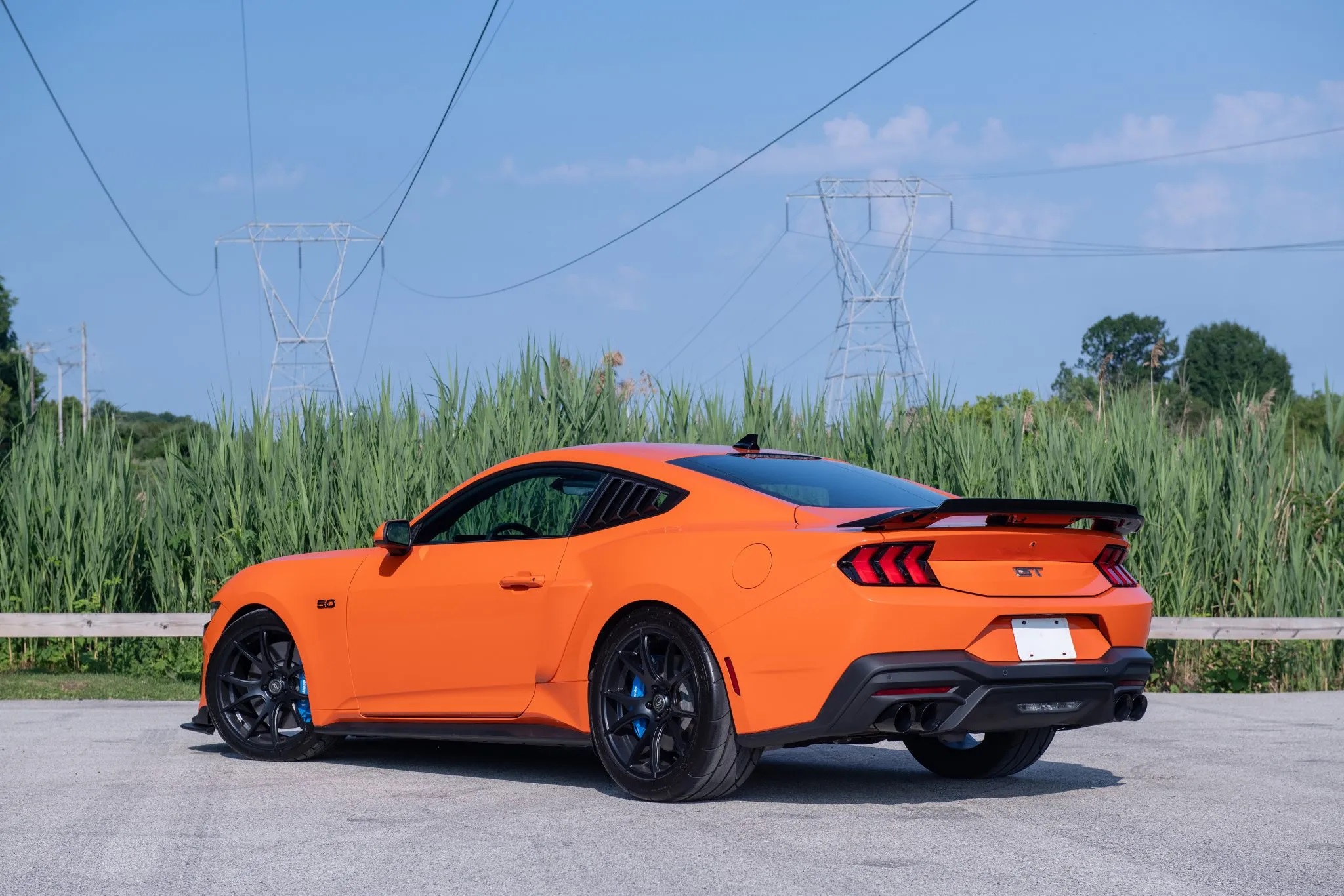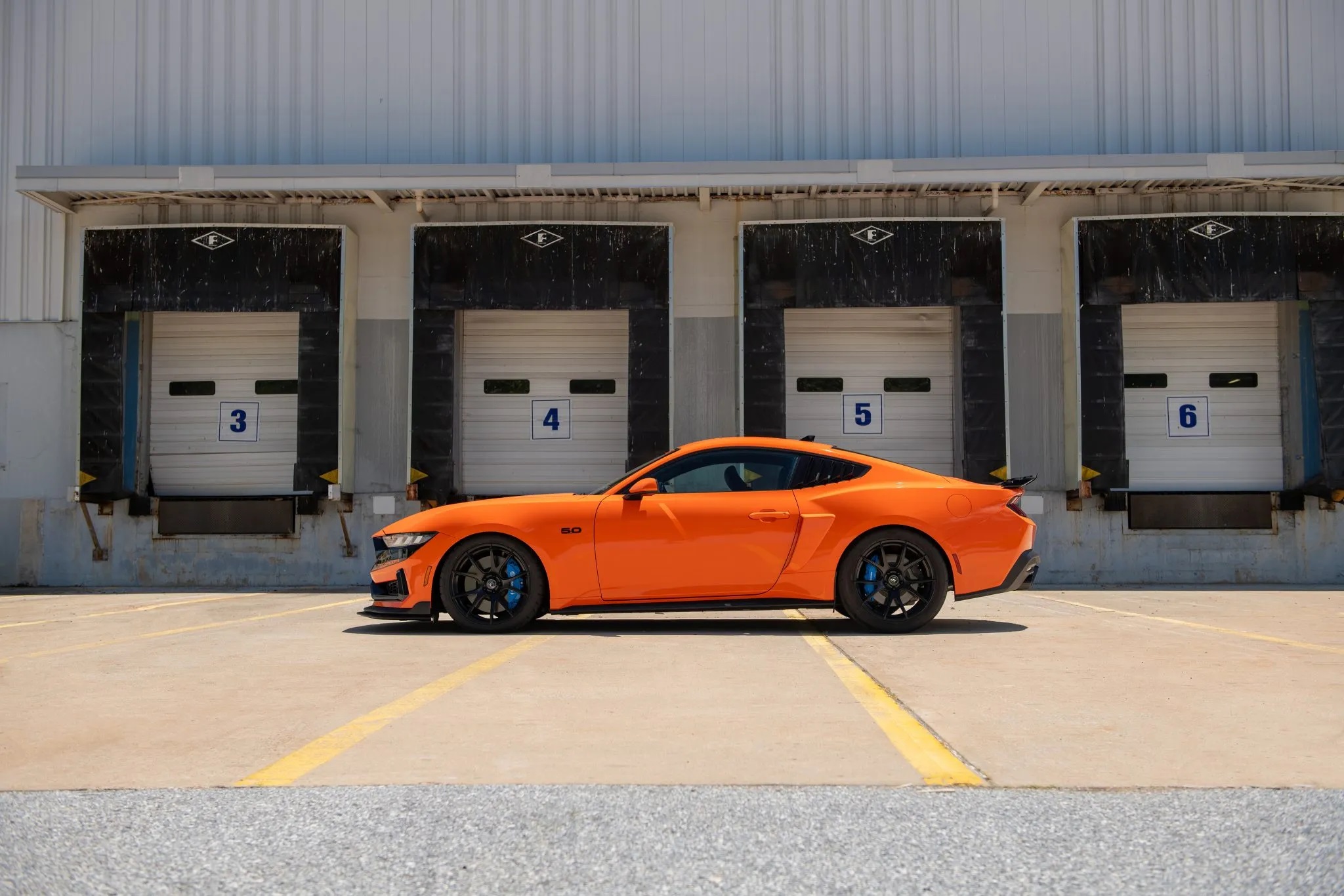 Roush Performance coilovers have been installed to lower the ride height for better handling. The car is equipped with staggered-width Forgestar CF5V wheels (20×9.5 front, 20×11 rear) fitted with Mickey Thompson tires (Street Comp front, ET Street SS rear), while an aluminum driveshaft from Driveshaft Shop ensures safe power transfer.