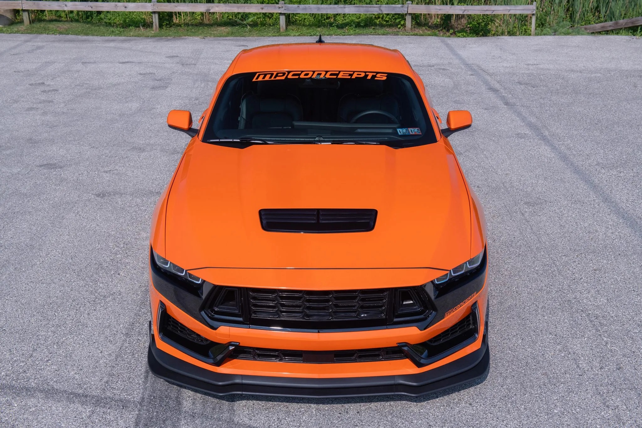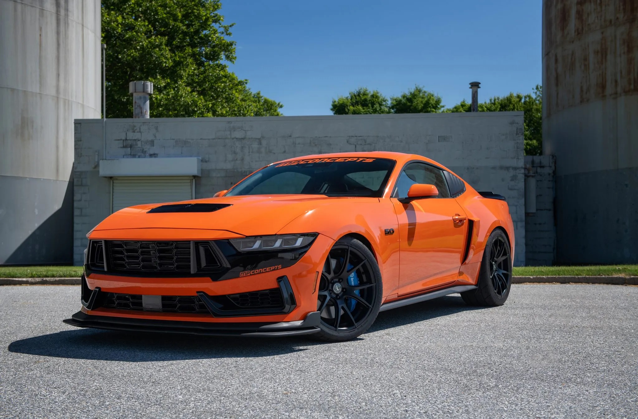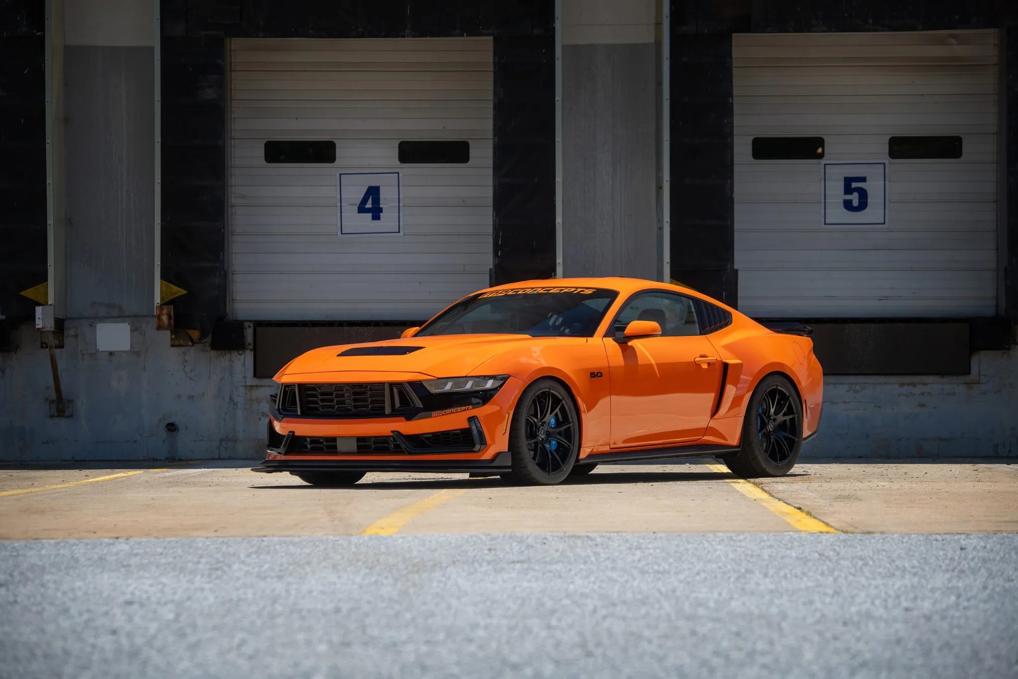 Originally finished in Carbonized Gray Metallic, the car now sports a bold Competition Orange vinyl wrap, the signature color of the charity. It also features a unique front bumper styled after the Dark Horse, integrated LED lights, MP Concepts quarter window louvers, and a GT500-style spoiler.