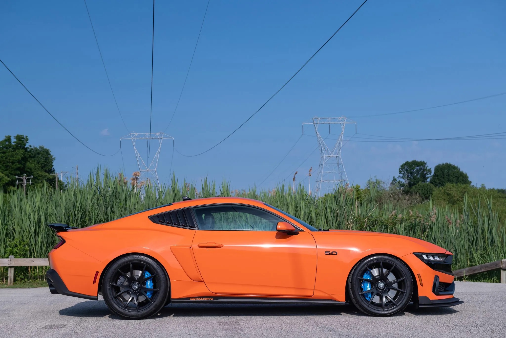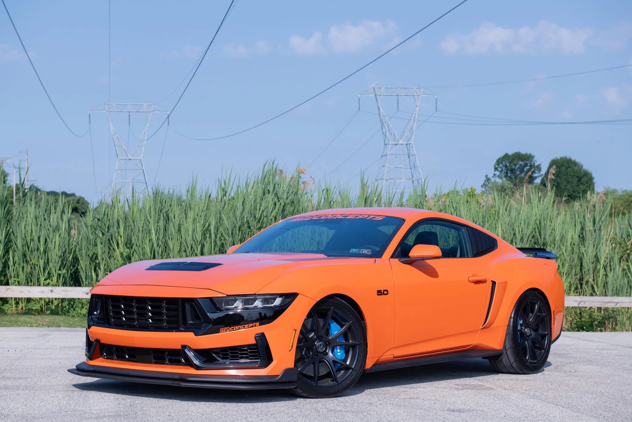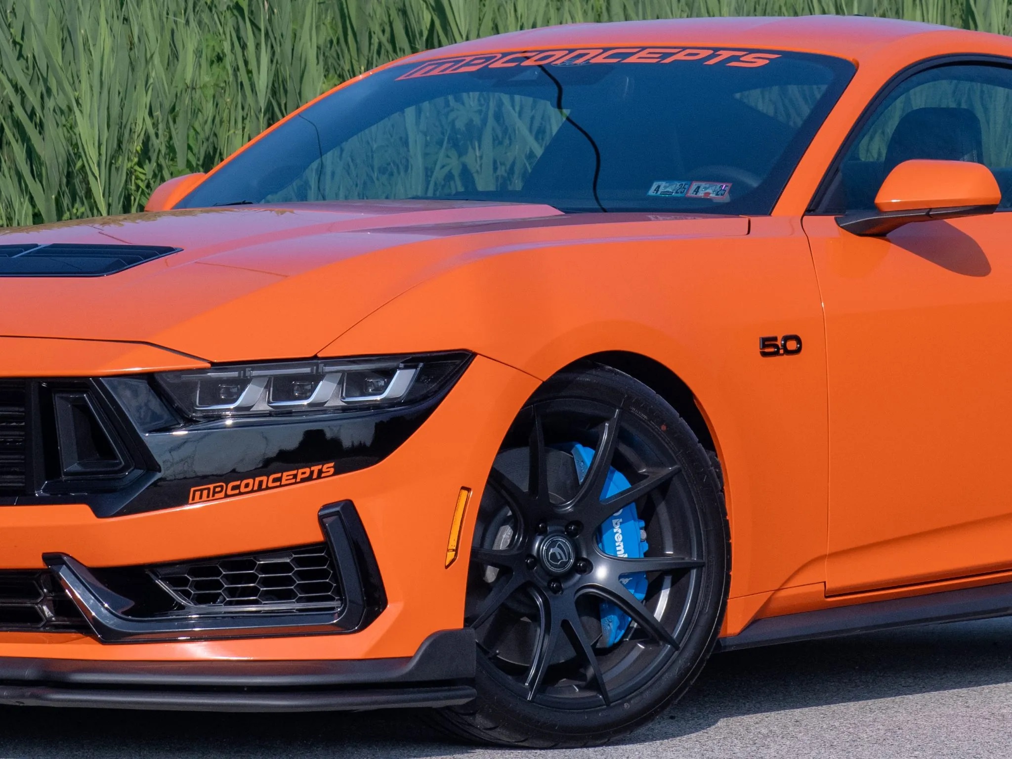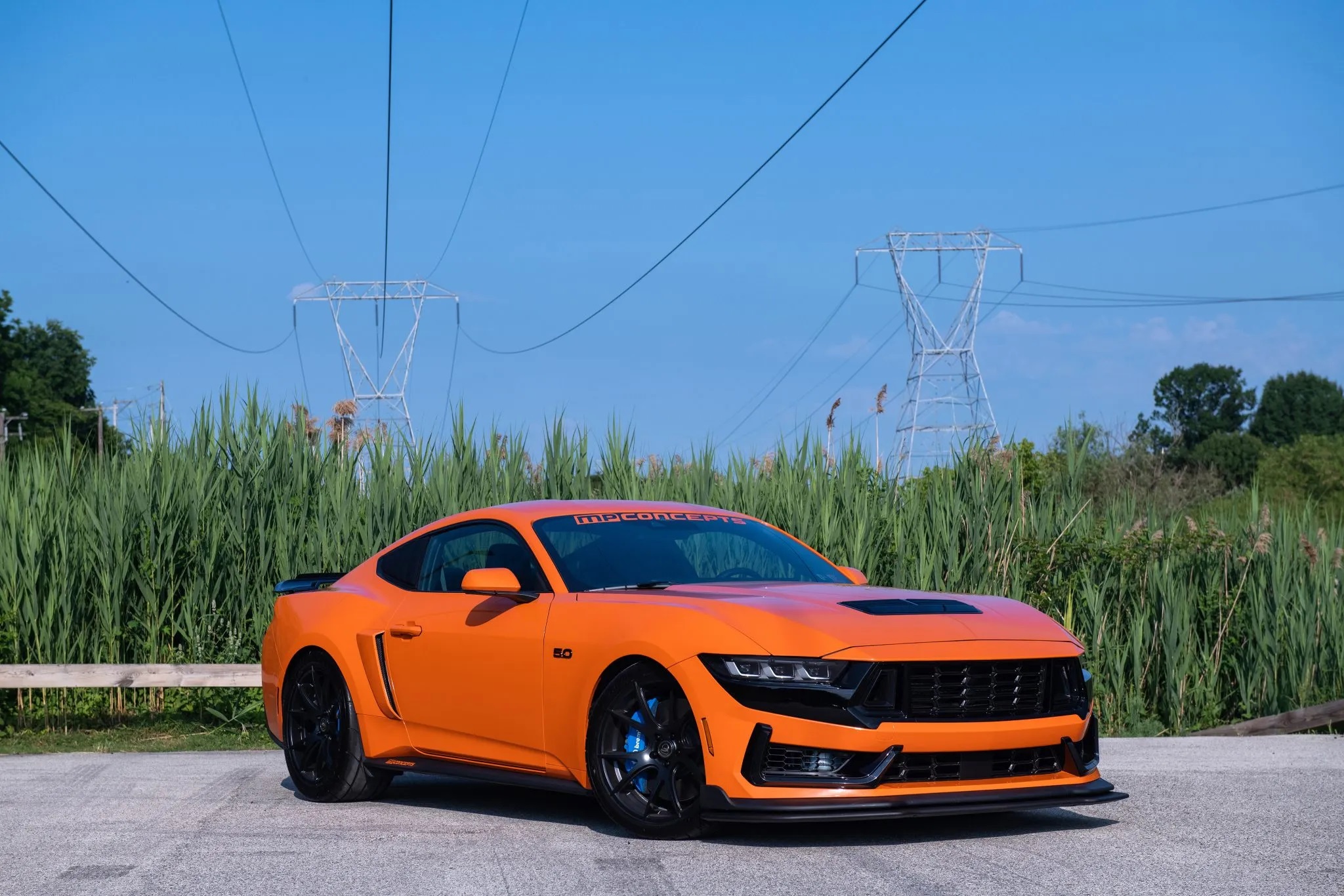 Originally finished in Carbonized Gray Metallic, the car now sports a bold Competition Orange vinyl wrap, the signature color of the charity. It also features a unique front bumper styled after the Dark Horse, integrated LED lights, MP Concepts quarter window louvers, and a GT500-style spoiler.