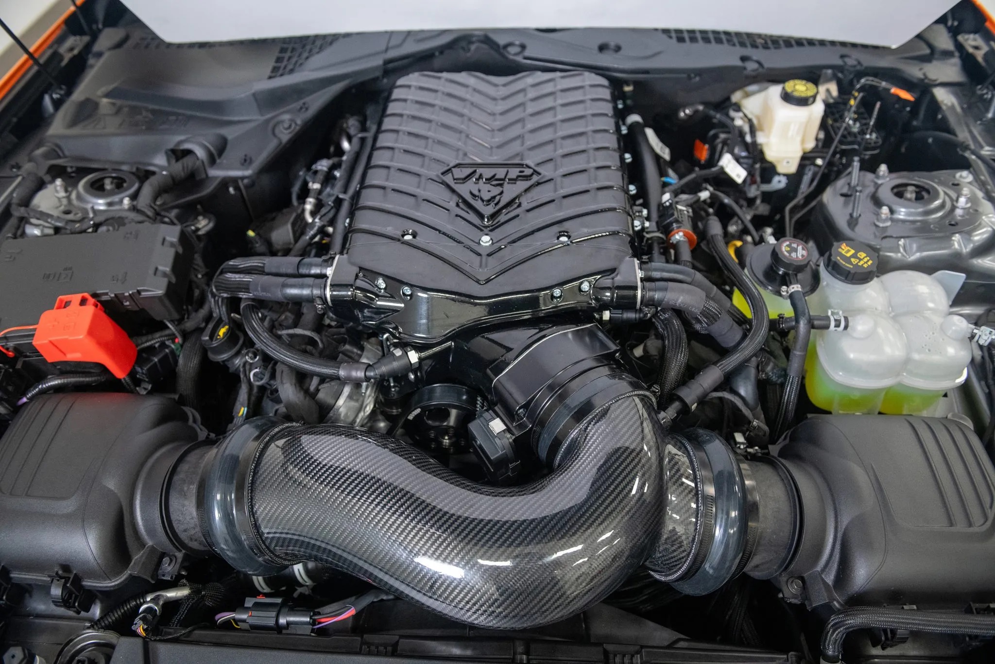 Under the hood, the 5.0-liter Coyote V8 is fitted with a VMP Performance “Stage 2” 3.0-liter supercharger kit, generating 726 horsepower and 545 lb-ft of torque. Additional upgrades include a carbon-fiber air intake hose and an AWE Tuning SwitchPath valved cat-back exhaust. Power is sent to the rear wheels via a 10-speed automatic transmission and a limited-slip differential.