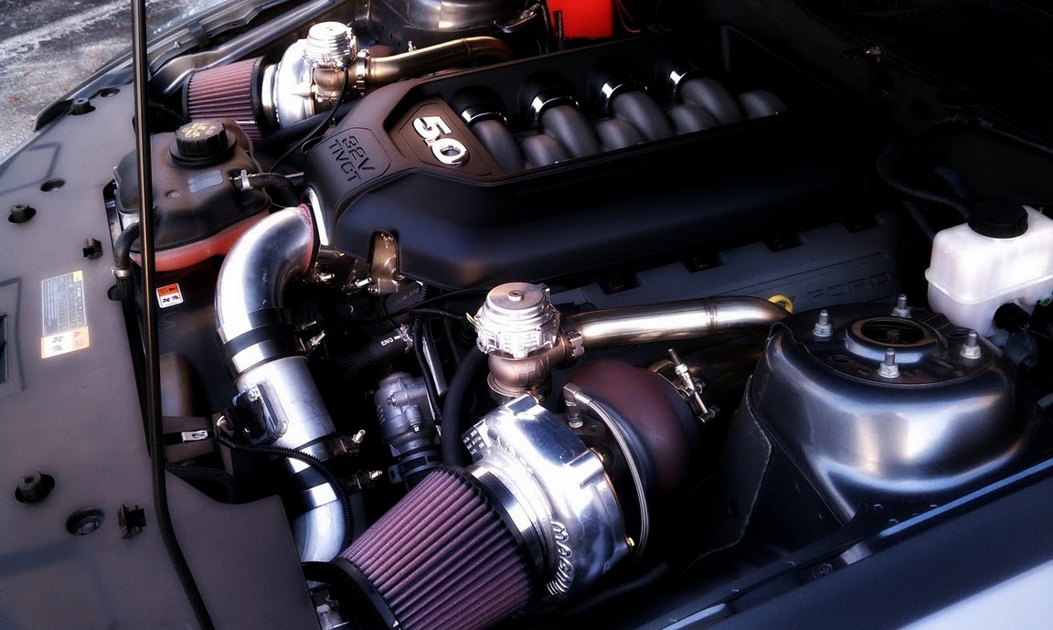 Well known Ford tuner Jon Lund has his hands full with his latest project, a twin turbo 2011 Mustang GT capable of running mid 9’s. Early testing at the drag strip on the twin turbo setup has yielded a [email protected] on 8 psi, not bad for a first run with the stock 19″ wheels up front and 15″ drag radials out back. What is more mind blowing is these numbers are achieved with a bone stock Mustang GT with the exception of lowering springs and an off-road x-pipe. The twin turbo setup was designed and built by Jake Long and Ken Bjonnes.