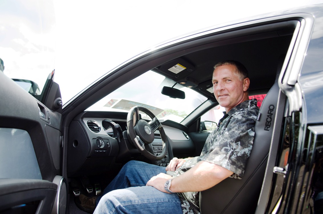 Mustang Dream Giveaway grand prize winner Timothy Millard sits behind the wheel of his new 2012 Shelby GT500 which is just one of the matching Shelby Mustangs he won as a result of a tax-deductible donation made to the World Cause Foundation.