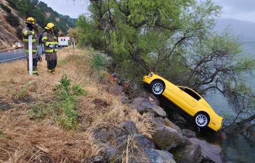 Death by water is not a term you want to hear or even think about but one Ford Mustang and its driver came pretty close after it slid off Highway 20 into Clear Lake near Lucerne, California only to be saved by a tree on the waters edge. The Yellow Ford Mustang in the picture was driven by a young man who says he was only going45 mph when he lost control of the vehicle. The driver was able to exit his the Mustang with no injuries. The Mustang was later rescued by a tow truck who brought it back up to the roadway.